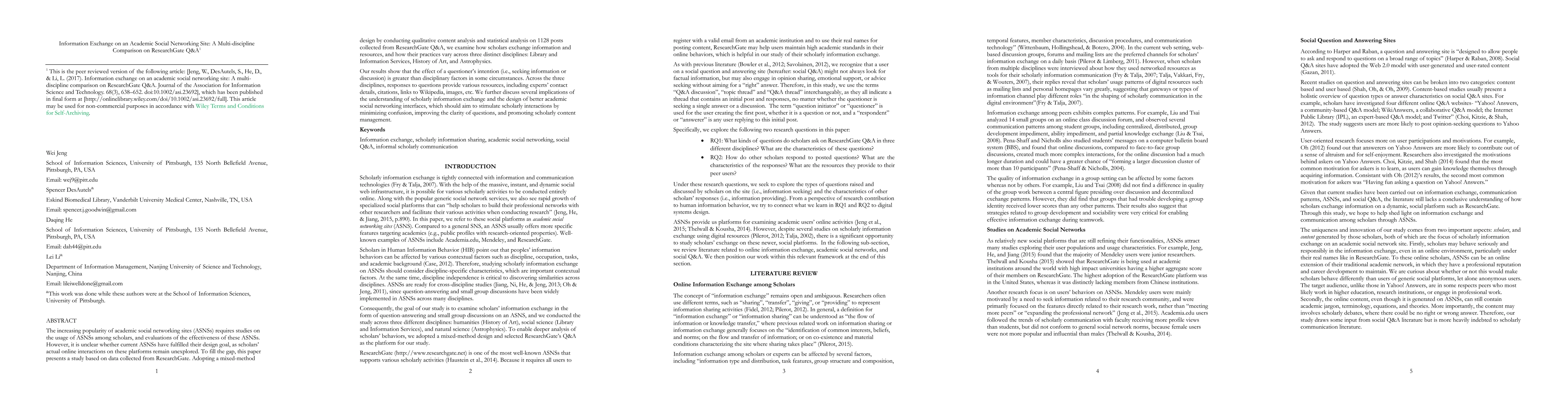 The increasing popularity of academic social networking sites (ASNSs) requires studies on the usage of ASNSs among scholars and evaluations of the effectiveness of these ASNSs. However, it is unclear whether current ASNSs have fulfilled their design goal, as scholars' actual online interactions on these platforms remain unexplored. To fill the gap, this article presents a study based on data collected from ResearchGate. Adopting a mixed-method design by conducting qualitative content analysis and statistical analysis on 1,128 posts collected from ResearchGate Q&A, we examine how scholars exchange information and resources, and how their practices vary across three distinct disciplines: library and information services, history of art, and astrophysics. Our results show that the effect of a questioner's intention (i.e., seeking information or discussion) is greater than disciplinary factors in some circumstances. Across the three disciplines, responses to questions provide various resources, including experts' contact details, citations, links to Wikipedia, images, and so on. We further discuss several implications of the understanding of scholarly information exchange and the design of better academic social networking interfaces, which should stimulate scholarly interactions by minimizing confusion, improving the clarity of questions, and promoting scholarly content management.