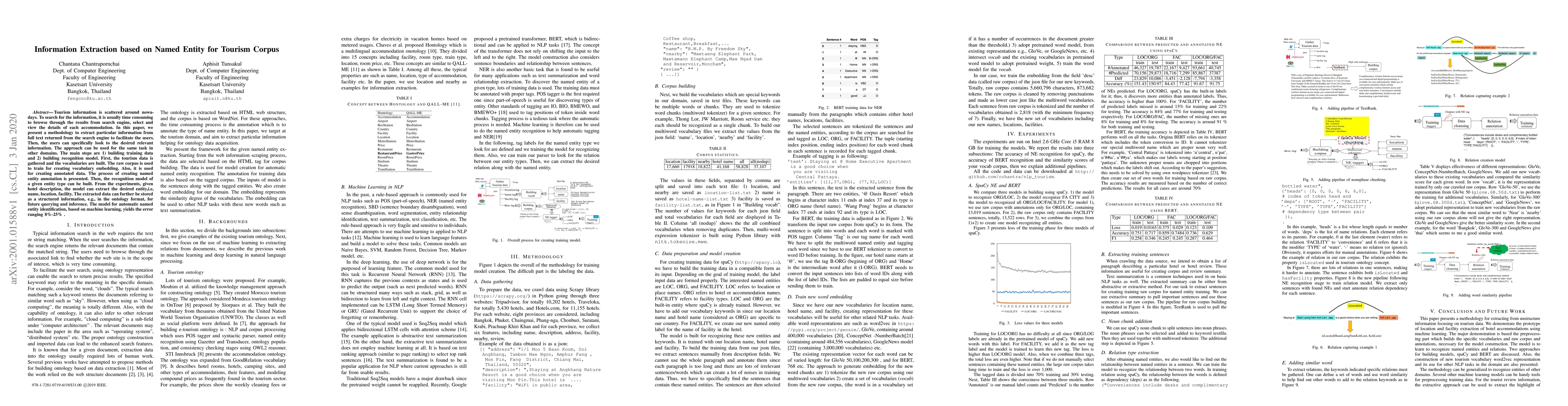 Tourism information is scattered around nowadays. To search for the information, it is usually time consuming to browse through the results from search engine, select and view the details of each accommodation. In this paper, we present a methodology to extract particular information from full text returned from the search engine to facilitate the users. Then, the users can specifically look to the desired relevant information. The approach can be used for the same task in other domains. The main steps are 1) building training data and 2) building recognition model. First, the tourism data is gathered and the vocabularies are built. The raw corpus is used to train for creating vocabulary embedding. Also, it is used for creating annotated data. The process of creating named entity annotation is presented. Then, the recognition model of a given entity type can be built. From the experiments, given hotel description, the model can extract the desired entity,i.e, name, location, facility. The extracted data can further be stored as a structured information, e.g., in the ontology format, for future querying and inference. The model for automatic named entity identification, based on machine learning, yields the error ranging 8%-25%.