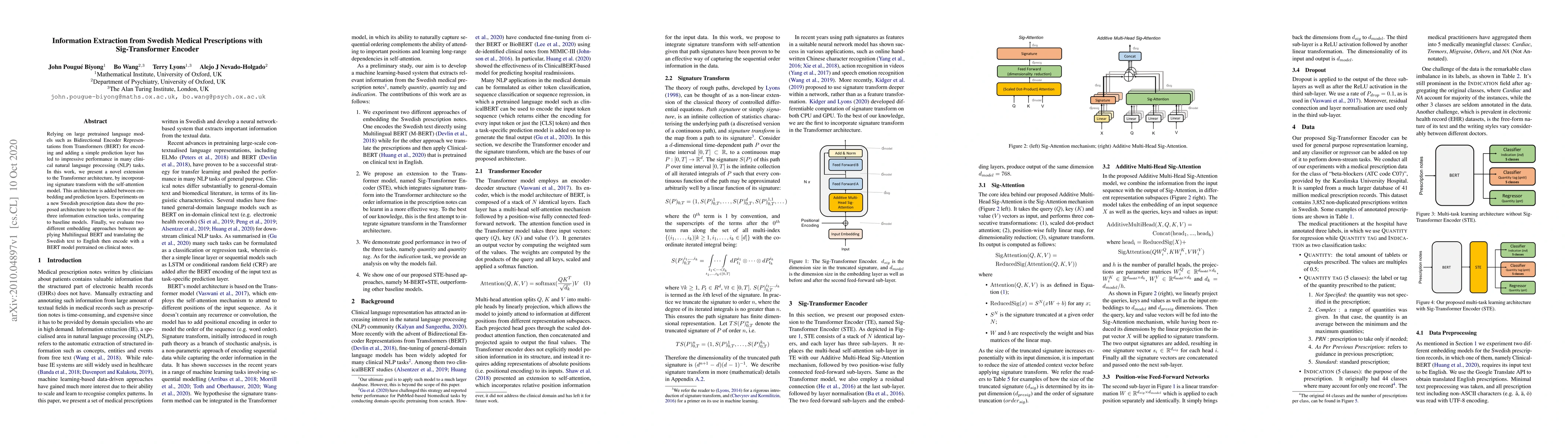 Researchers proposed a novel Transformer architecture that improves information extraction from Swedish medical prescriptions, outperforming baseline models in two of three tasks. The new model incorporates signature transformation with self-attention, yielding superior performance on clinical NLP tasks.