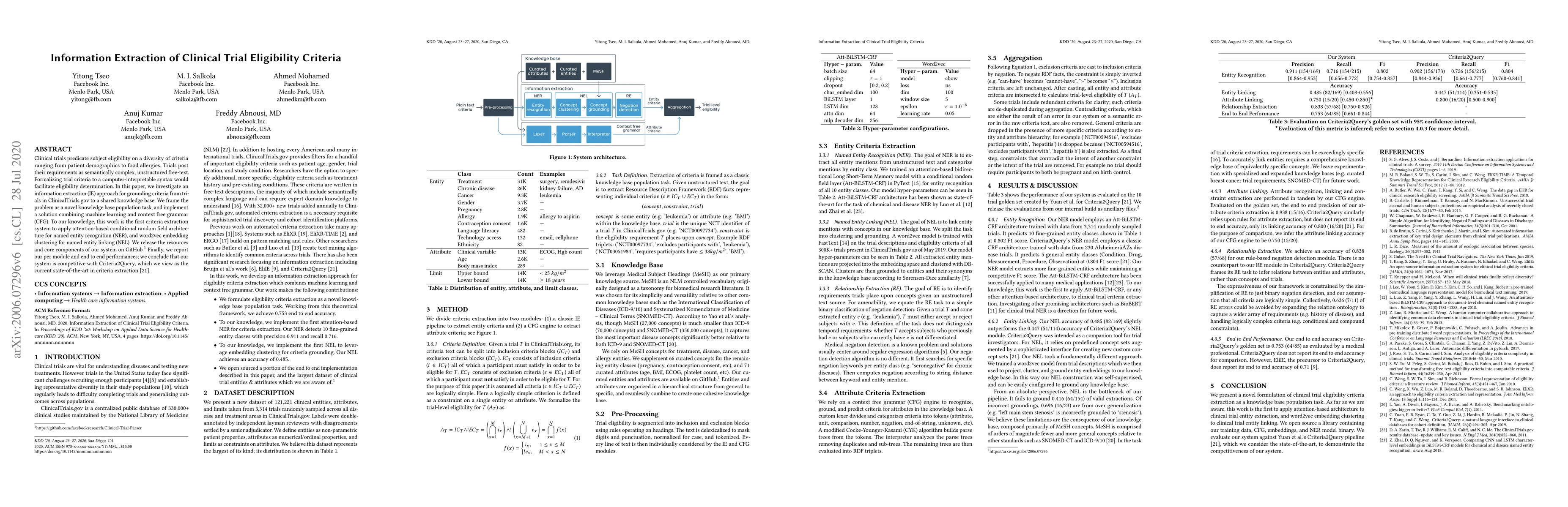 This paper presents an information extraction method to formalize clinical trial eligibility criteria from unstructured text into a computer-interpretable format. It employs machine learning and context-free grammar, including an attention-based CRF for named entity recognition and word2vec for entity linking, achieving competitive performance against existing systems.