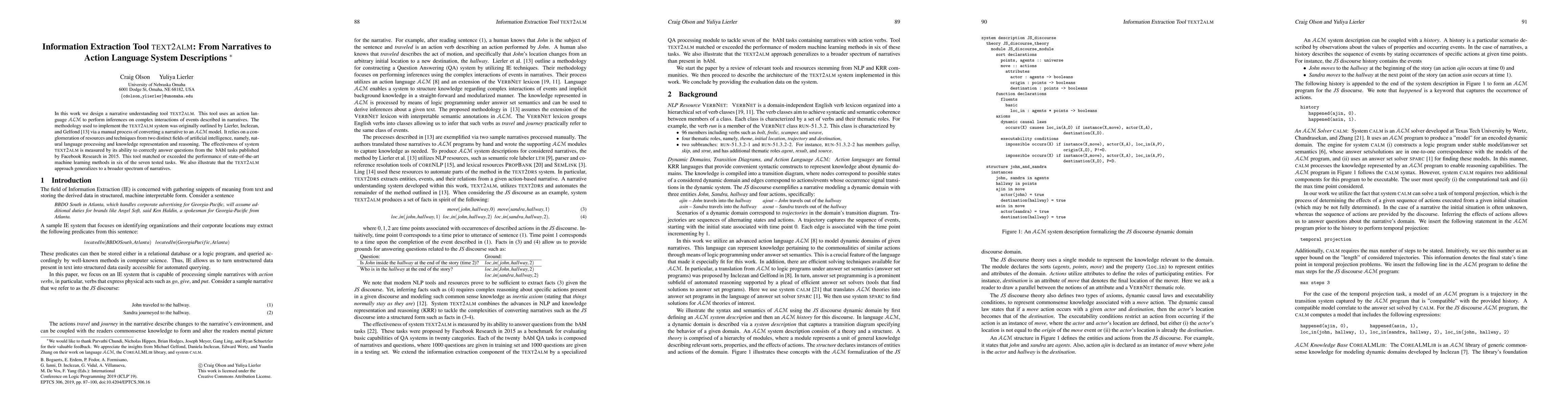 In this work we design a narrative understanding tool Text2ALM. This tool uses an action language ALM to perform inferences on complex interactions of events described in narratives. The methodology used to implement the Text2ALM system was originally outlined by Lierler, Inclezan, and Gelfond (2017) via a manual process of converting a narrative to an ALM model. It relies on a conglomeration of resources and techniques from two distinct fields of artificial intelligence, namely, natural language processing and knowledge representation and reasoning. The effectiveness of system Text2ALM is measured by its ability to correctly answer questions from the bAbI tasks published by Facebook Research in 2015. This tool matched or exceeded the performance of state-of-the-art machine learning methods in six of the seven tested tasks. We also illustrate that the Text2ALM approach generalizes to a broader spectrum of narratives.