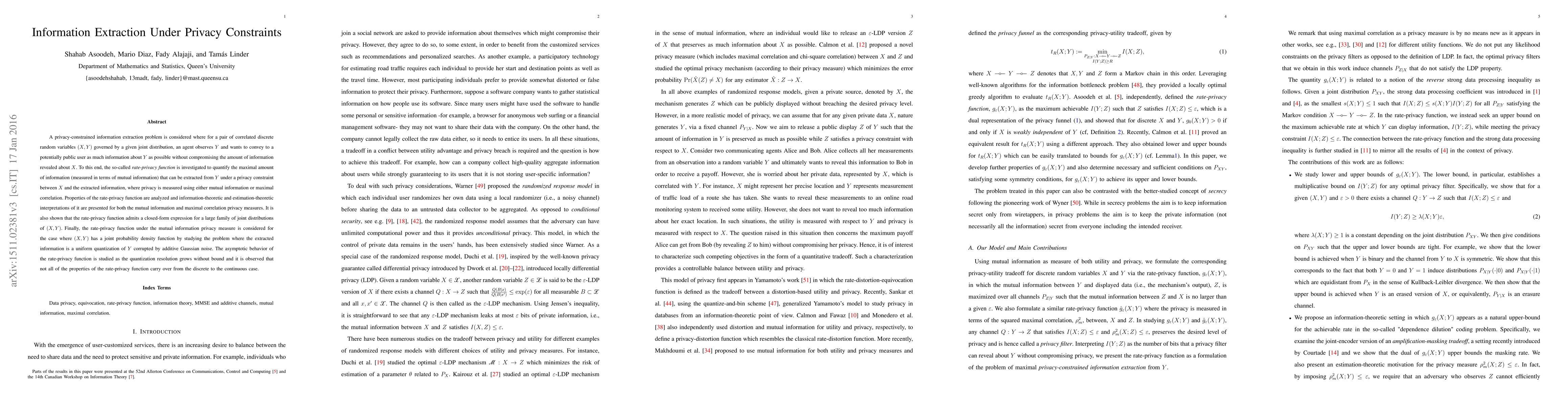 A privacy-constrained information extraction problem is considered where for a pair of correlated discrete random variables $(X,Y)$ governed by a given joint distribution, an agent observes $Y$ and wants to convey to a potentially public user as much information about $Y$ as possible without compromising the amount of information revealed about $X$. To this end, the so-called {\em rate-privacy function} is introduced to quantify the maximal amount of information (measured in terms of mutual information) that can be extracted from $Y$ under a privacy constraint between $X$ and the extracted information, where privacy is measured using either mutual information or maximal correlation. Properties of the rate-privacy function are analyzed and information-theoretic and estimation-theoretic interpretations of it are presented for both the mutual information and maximal correlation privacy measures. It is also shown that the rate-privacy function admits a closed-form expression for a large family of joint distributions of $(X,Y)$. Finally, the rate-privacy function under the mutual information privacy measure is considered for the case where $(X,Y)$ has a joint probability density function by studying the problem where the extracted information is a uniform quantization of $Y$ corrupted by additive Gaussian noise. The asymptotic behavior of the rate-privacy function is studied as the quantization resolution grows without bound and it is observed that not all of the properties of the rate-privacy function carry over from the discrete to the continuous case.