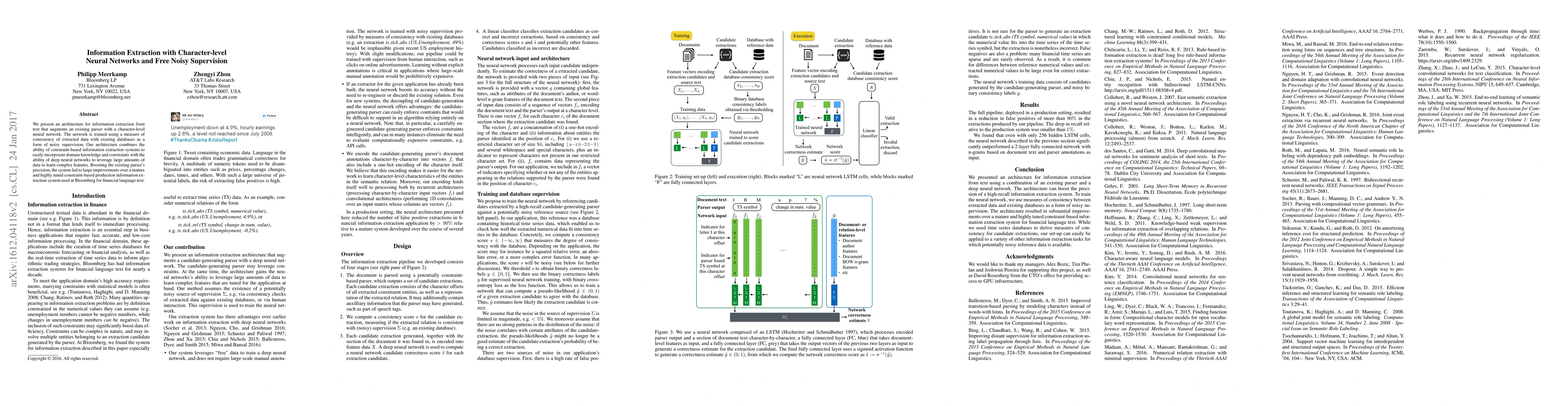 We present an architecture for information extraction from text that augments an existing parser with a character-level neural network. The network is trained using a measure of consistency of extracted data with existing databases as a form of noisy supervision. Our architecture combines the ability of constraint-based information extraction systems to easily incorporate domain knowledge and constraints with the ability of deep neural networks to leverage large amounts of data to learn complex features. Boosting the existing parser's precision, the system led to large improvements over a mature and highly tuned constraint-based production information extraction system used at Bloomberg for financial language text.
