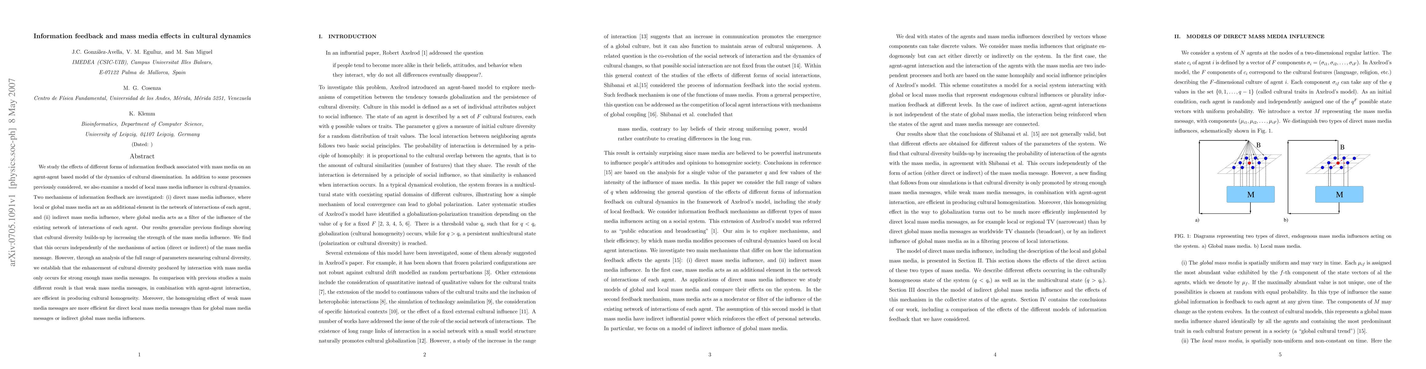 This paper investigates the impact of direct and indirect mass media feedback on cultural dynamics using an agent-based model. It finds that strong mass media messages enhance cultural diversity, while weak messages, especially direct local media, can lead to cultural homogeneity.