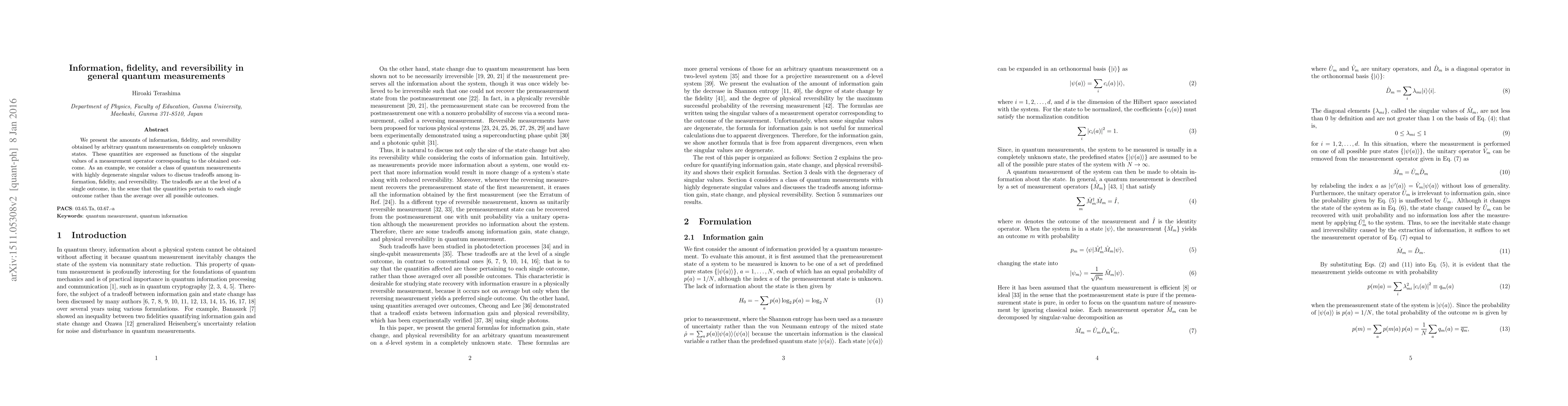 This paper explores the relationships between information, fidelity, and reversibility in quantum measurements on unknown states, expressing these quantities in terms of measurement operator singular values. It highlights tradeoffs among these factors for individual measurement outcomes, rather than averaged results.