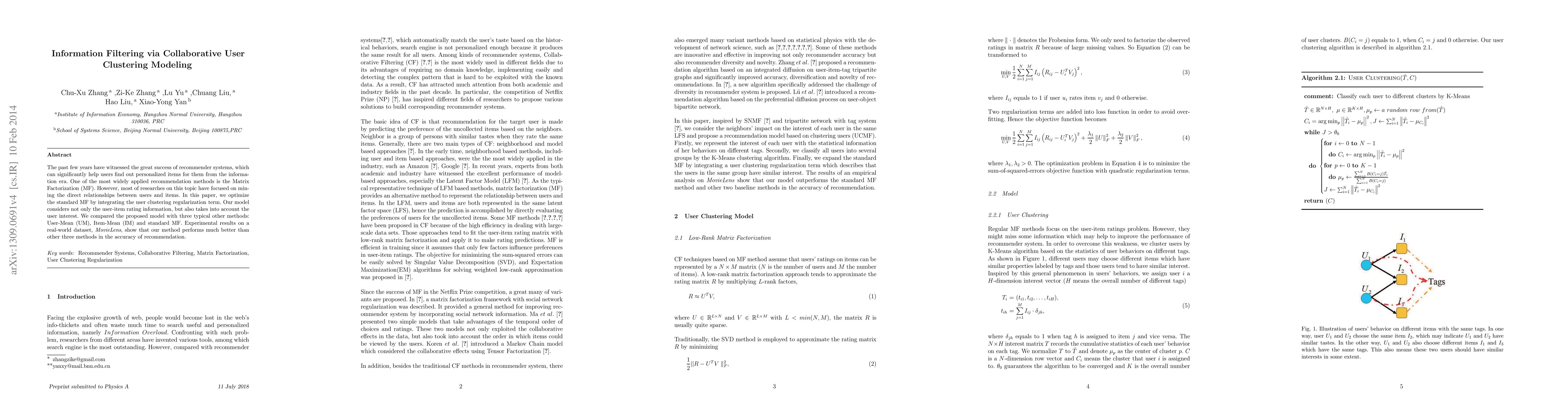 The past few years have witnessed the great success of recommender systems, which can significantly help users find out personalized items for them from the information era. One of the most widely applied recommendation methods is the Matrix Factorization (MF). However, most of researches on this topic have focused on mining the direct relationships between users and items. In this paper, we optimize the standard MF by integrating the user clustering regularization term. Our model considers not only the user-item rating information, but also takes into account the user interest. We compared the proposed model with three typical other methods: User-Mean (UM), Item-Mean (IM) and standard MF. Experimental results on a real-world dataset, \emph{MovieLens}, show that our method performs much better than other three methods in the accuracy of recommendation.