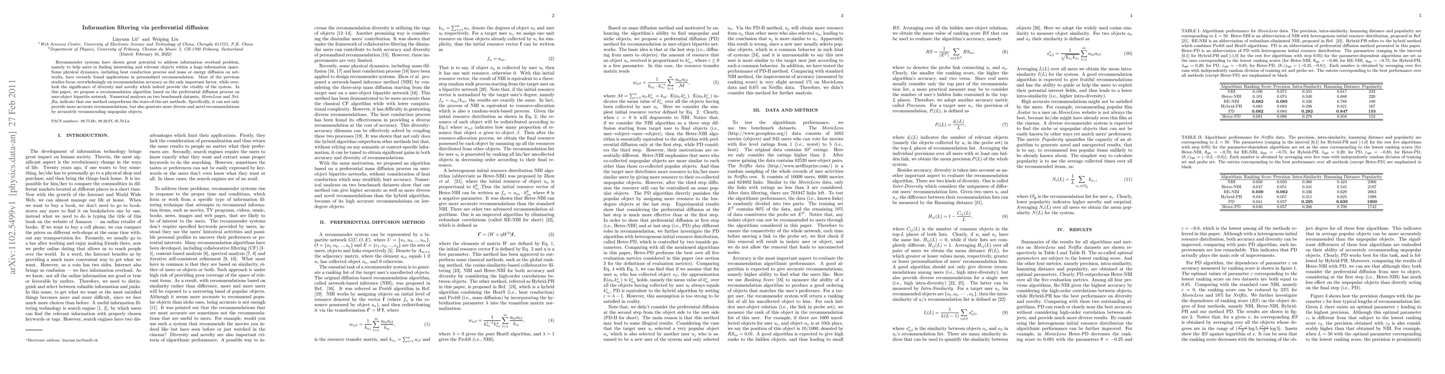 This paper proposes a recommendation algorithm based on preferential diffusion process, enhancing recommendation accuracy, diversity, and novelty. Tested on MovieLens and Netflix datasets, the method outperforms existing techniques by providing precise recommendations for less popular items.