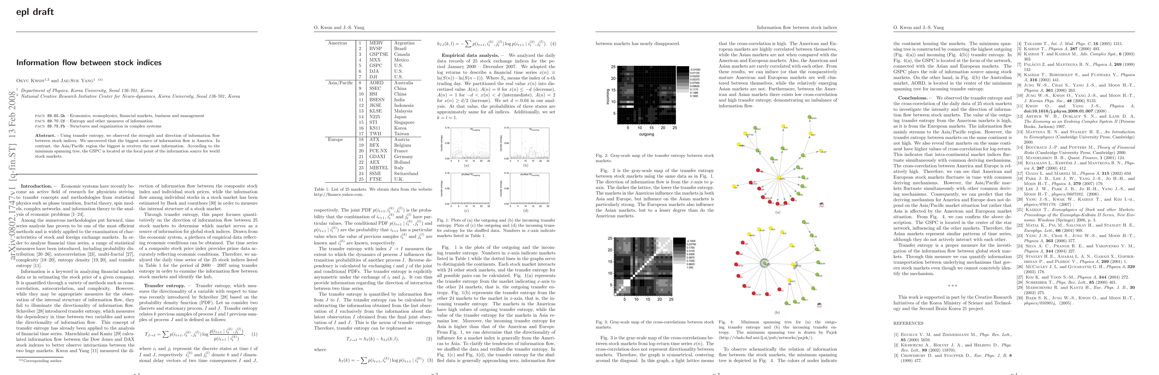 Research using transfer entropy reveals that America is a major source of information flow to world stock markets, while the Asia/Pacific region receives the most information. The GSPC index serves as a central hub for global market information.
