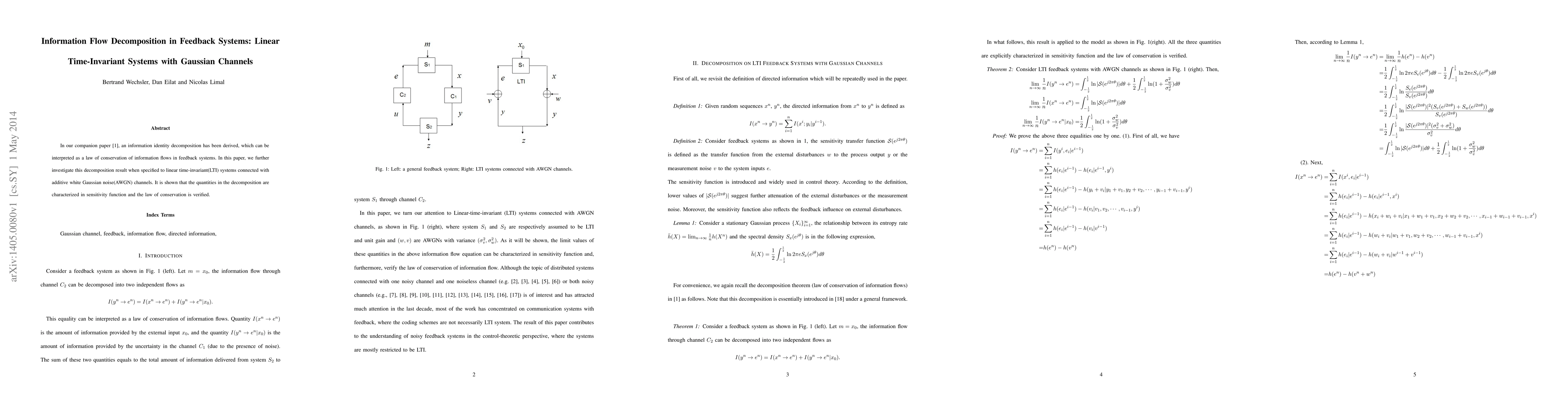 In our companion paper [1], an information identity decomposition has been derived, which can be interpreted as a law of conservation of information flows in feedback systems. In this paper, we further investigate this decomposition result when specified to linear time-invariant(LTI) systems connected with additive white Gaussian noise(AWGN) channels. It is shown that the quantities in the decomposition are characterized in sensitivity function and the law of conservation is verified.