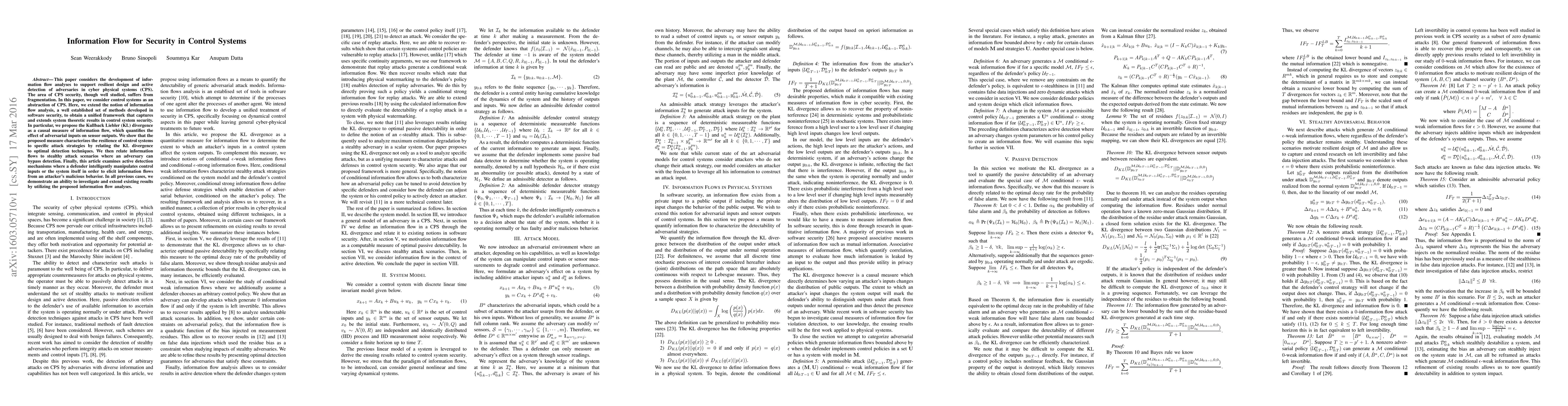 This paper considers the development of information flow analyses to support resilient design and active detection of adversaries in cyber physical systems (CPS). The area of CPS security, though well studied, suffers from fragmentation. In this paper, we consider control systems as an abstraction of CPS. Here, we extend the notion of information flow analysis, a well established set of methods developed in software security, to obtain a unified framework that captures and extends system theoretic results in control system security. In particular, we propose the Kullback Liebler (KL) divergence as a causal measure of information flow, which quantifies the effect of adversarial inputs on sensor outputs. We show that the proposed measure characterizes the resilience of control systems to specific attack strategies by relating the KL divergence to optimal detection techniques. We then relate information flows to stealthy attack scenarios where an adversary can bypass detection. Finally, this article examines active detection mechanisms where a defender intelligently manipulates control inputs or the system itself in order to elicit information flows from an attacker's malicious behavior. In all previous cases, we demonstrate an ability to investigate and extend existing results by utilizing the proposed information flow analyses.