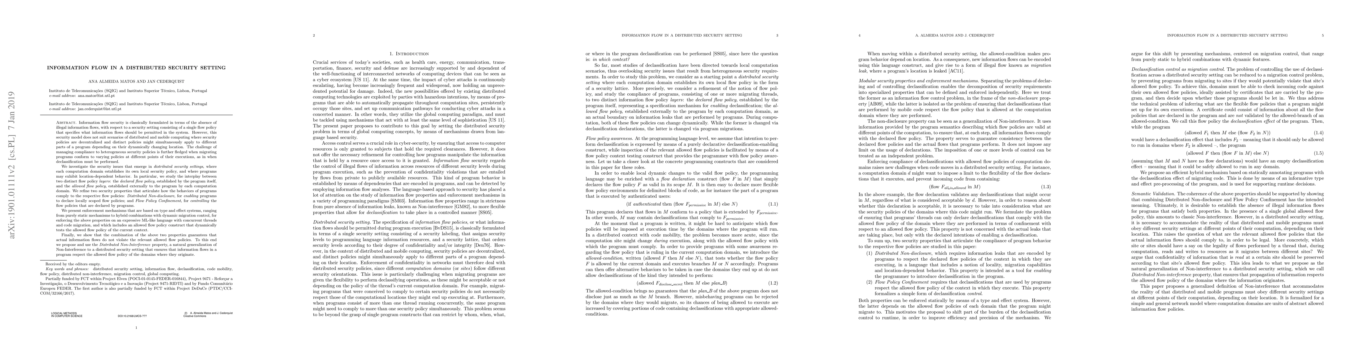 The paper adopts a distributed computation model where domains are units of security policies, each with its own allowed flow policy. It investigates information flow security in such a setting, focusing on the interplay between declared and allowed flow policies.