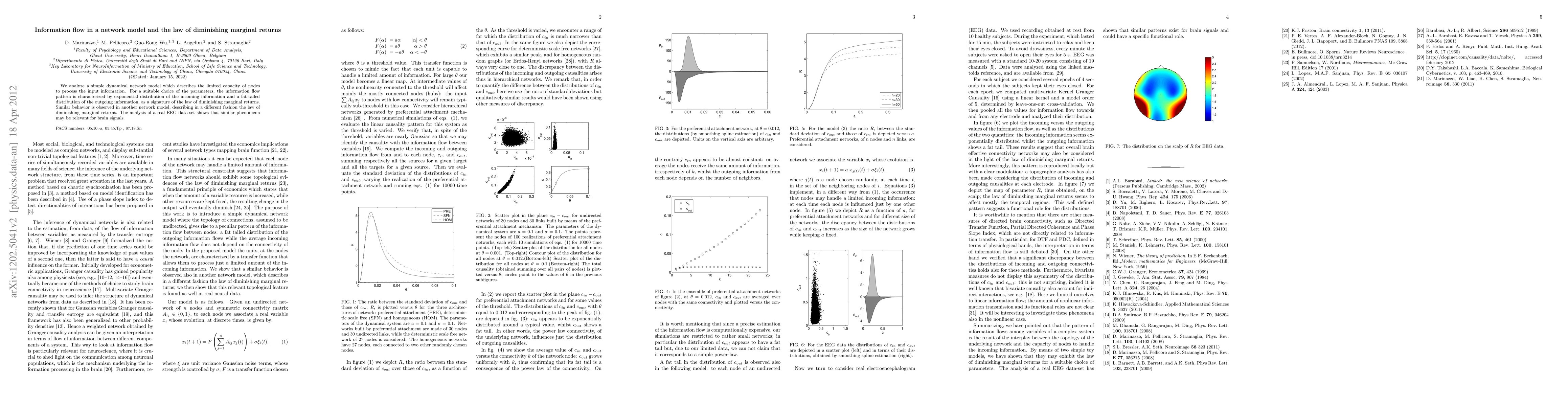 This paper examines a network model illustrating nodes' limited information processing capacity, revealing an exponential distribution of incoming info and a fat-tailed distribution of outgoing info, indicative of diminishing marginal returns. Real EEG data analysis suggests similar patterns in brain signals.