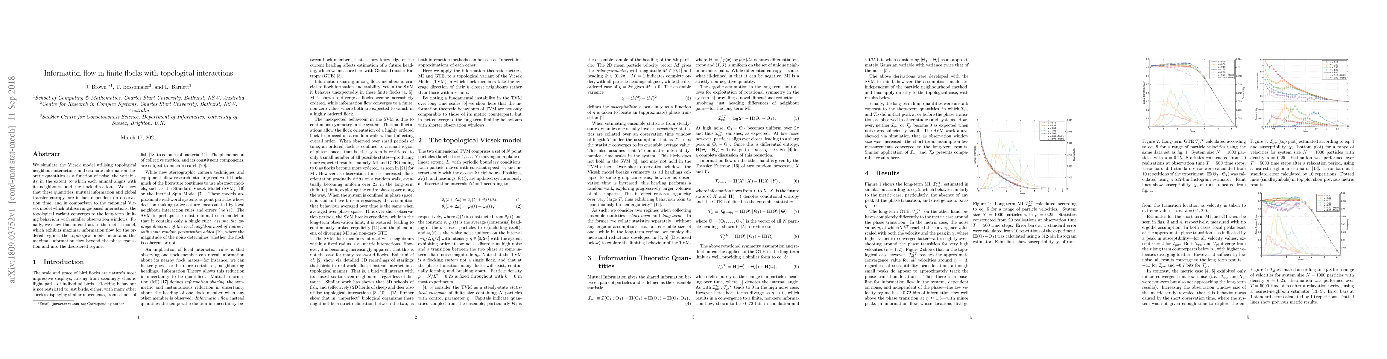 We simulate the Vicsek model utilising topological neighbour interactions and estimate information theoretic quantities as a function of noise, the variability in the extent to which each animal aligns with its neighbours, and the flock direction. We show that these quantities, mutual information and global transfer entropy, are in fact dependent on observation time, and in comparison to the canonical Vicsek model which utilises range-based interactions, the topological variant converges to the long-term limiting behaviour with smaller observation windows. Finally, we show that in contrast to the metric model, which exhibits maximal information flow for the ordered regime, the topological model maintains this maximal information flow beyond the phase transition and into the disordered regime.