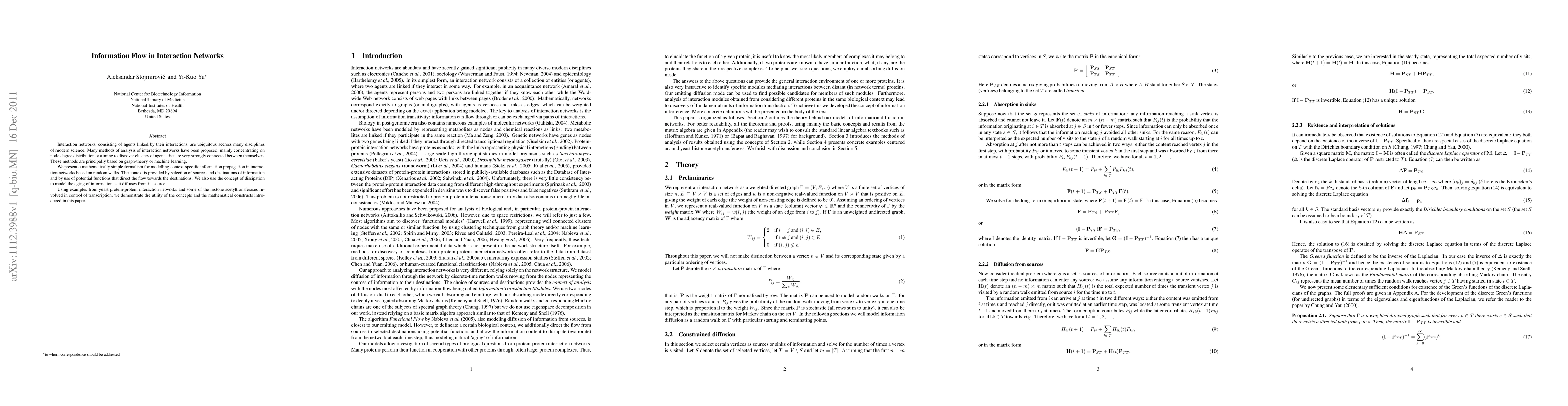 This paper proposes a simple mathematical model for modeling information flow in interaction networks using random walks, with context provided by selected sources, destinations, and potential functions. The model also incorporates dissipation to simulate information aging, demonstrated through yeast protein-protein interaction networks.