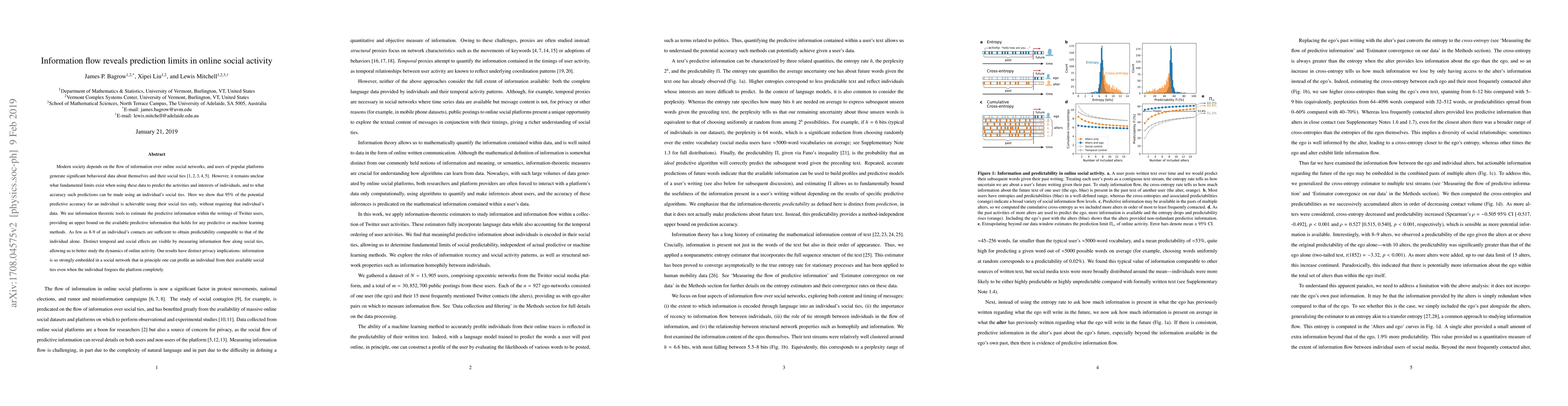 Modern society depends on the flow of information over online social networks, and users of popular platforms generate significant behavioral data about themselves and their social ties. However, it remains unclear what fundamental limits exist when using these data to predict the activities and interests of individuals, and to what accuracy such predictions can be made using an individual's social ties. Here we show that 95% of the potential predictive accuracy for an individual is achievable using their social ties only, without requiring that individual's data. We use information theoretic tools to estimate the predictive information within the writings of Twitter users, providing an upper bound on the available predictive information that holds for any predictive or machine learning methods. As few as 8-9 of an individual's contacts are sufficient to obtain predictability comparable to that of the individual alone. Distinct temporal and social effects are visible by measuring information flow along social ties, allowing us to better study the dynamics of online activity. Our results have distinct privacy implications: information is so strongly embedded in a social network that in principle one can profile an individual from their available social ties even when the individual forgoes the platform completely.