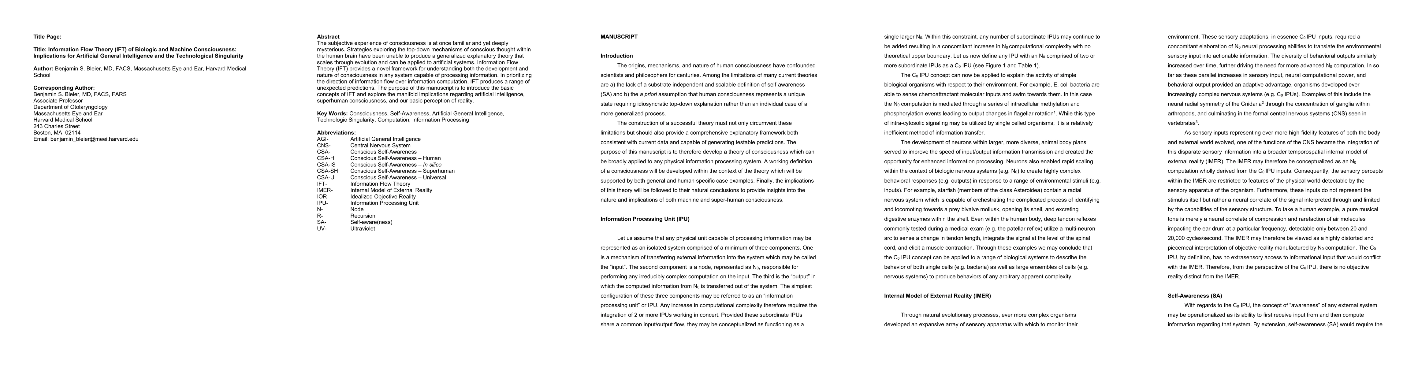 The Information Flow Theory (IFT) offers a novel framework for understanding consciousness in both biological and artificial systems by prioritizing information flow over computation. This theory has significant implications for artificial general intelligence and the potential for a technological singularity.