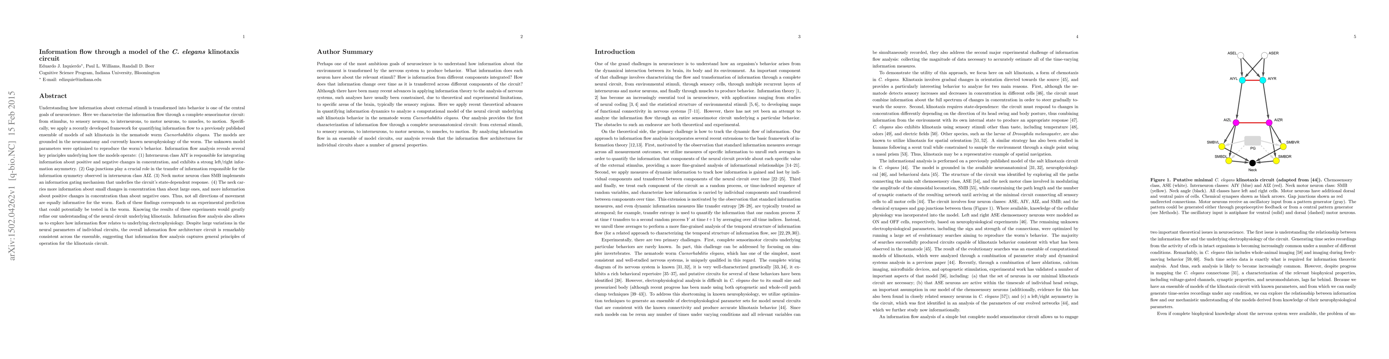 Understanding how information about external stimuli is transformed into behavior is one of the central goals of neuroscience. Here we characterize the information flow through a complete sensorimotor circuit: from stimulus, to sensory neurons, to interneurons, to motor neurons, to muscles, to motion. Specifically, we apply a recently developed framework for quantifying information flow to a previously published ensemble of models of salt klinotaxis in the nematode worm C. elegans. The models are grounded in the neuroanatomy and currently known neurophysiology of the worm. The unknown model parameters were optimized to reproduce the worm's behavior. Information flow analysis reveals several key principles underlying how the models operate: (1) Interneuron class AIY is responsible for integrating information about positive and negative changes in concentration, and exhibits a strong left/right information asymmetry. (2) Gap junctions play a crucial role in the transfer of information responsible for the information symmetry observed in interneuron class AIZ. (3) Neck motor neuron class SMB implements an information gating mechanism that underlies the circuit's state-dependent response. (4) The neck carries non-uniform distribution about changes in concentration. Thus, not all directions of movement are equally informative. Each of these findings corresponds to an experimental prediction that could be tested in the worm to greatly refine our understanding of the neural circuit underlying klinotaxis. Information flow analysis also allows us to explore how information flow relates to underlying electrophysiology. Despite large variations in the neural parameters of individual circuits, the overall information flow architecture circuit is remarkably consistent across the ensemble, suggesting that information flow analysis captures general principles of operation for the klinotaxis circuit.