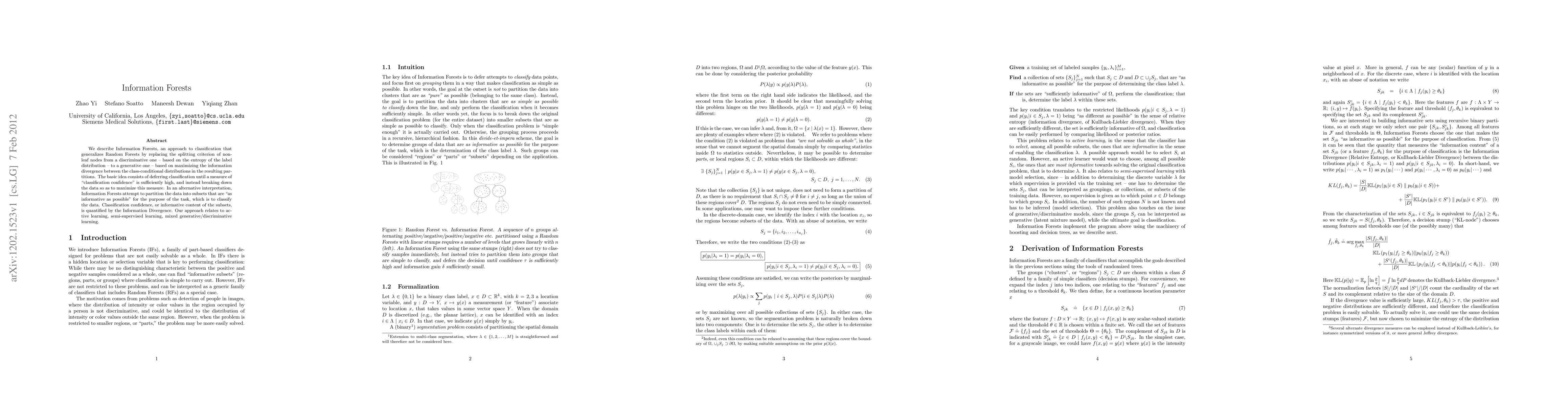 We describe Information Forests, an approach to classification that generalizes Random Forests by replacing the splitting criterion of non-leaf nodes from a discriminative one -- based on the entropy of the label distribution -- to a generative one -- based on maximizing the information divergence between the class-conditional distributions in the resulting partitions. The basic idea consists of deferring classification until a measure of "classification confidence" is sufficiently high, and instead breaking down the data so as to maximize this measure. In an alternative interpretation, Information Forests attempt to partition the data into subsets that are "as informative as possible" for the purpose of the task, which is to classify the data. Classification confidence, or informative content of the subsets, is quantified by the Information Divergence. Our approach relates to active learning, semi-supervised learning, mixed generative/discriminative learning.