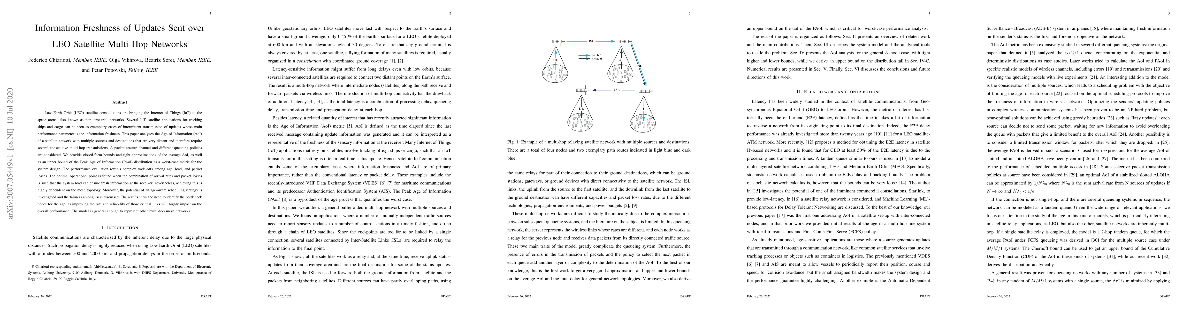 This paper investigates the Age of Information (AoI) in Low Earth Orbit (LEO) satellite multi-hop networks, focusing on the freshness of IoT updates. It provides closed-form bounds and approximations for average AoI and explores the impact of packet losses and network topology on performance, highlighting the importance of bottleneck nodes for optimal information freshness.
