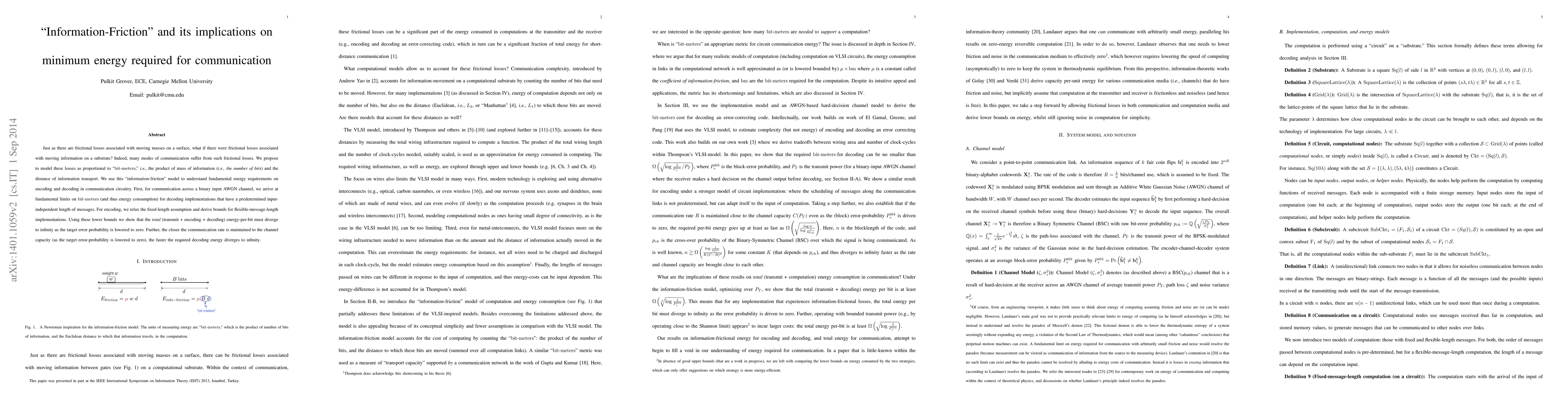 Just as there are frictional losses associated with moving masses on a surface, what if there were frictional losses associated with moving information on a substrate? Indeed, many modes of communication suffer from such frictional losses. We propose to model these losses as proportional to "bit-meters," i.e., the product of mass of information (i.e., the number of bits) and the distance of information transport. We use this "information- friction" model to understand fundamental energy requirements on encoding and decoding in communication circuitry. First, for communication across a binary input AWGN channel, we arrive at fundamental limits on bit-meters (and thus energy consumption) for decoding implementations that have a predetermined input-independent length of messages. For encoding, we relax the fixed-length assumption and derive bounds for flexible-message- length implementations. Using these lower bounds we show that the total (transmit + encoding + decoding) energy-per-bit must diverge to infinity as the target error probability is lowered to zero. Further, the closer the communication rate is maintained to the channel capacity (as the target error-probability is lowered to zero), the faster the required decoding energy diverges to infinity.