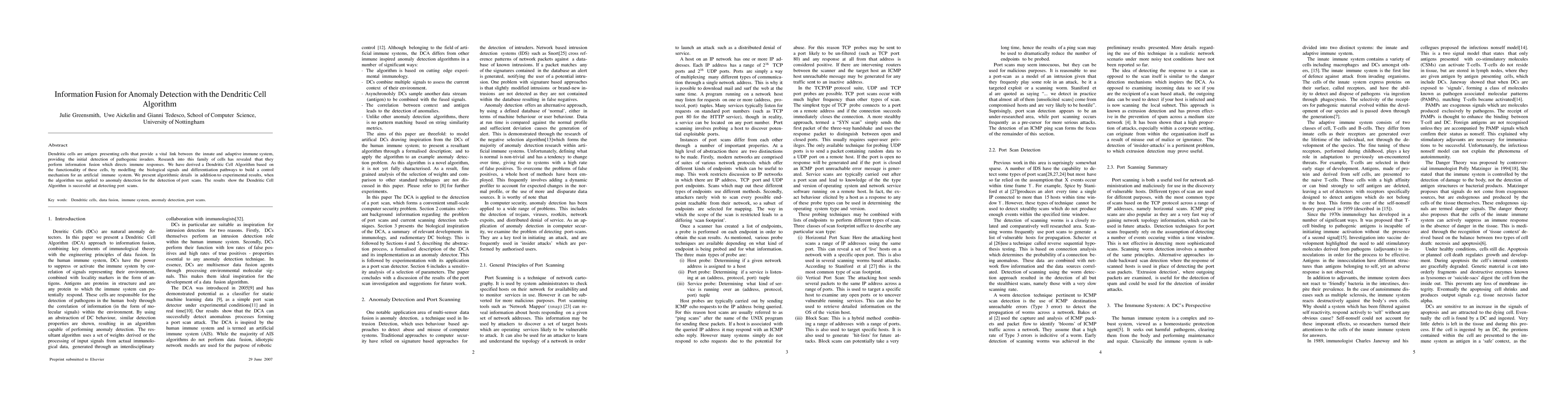 The Dendritic Cell Algorithm mimics the information fusion processes of dendritic cells to create an effective artificial immune system for anomaly detection, successfully identifying port scans in experiments. This bio-inspired approach demonstrates potential for enhancing cybersecurity measures.