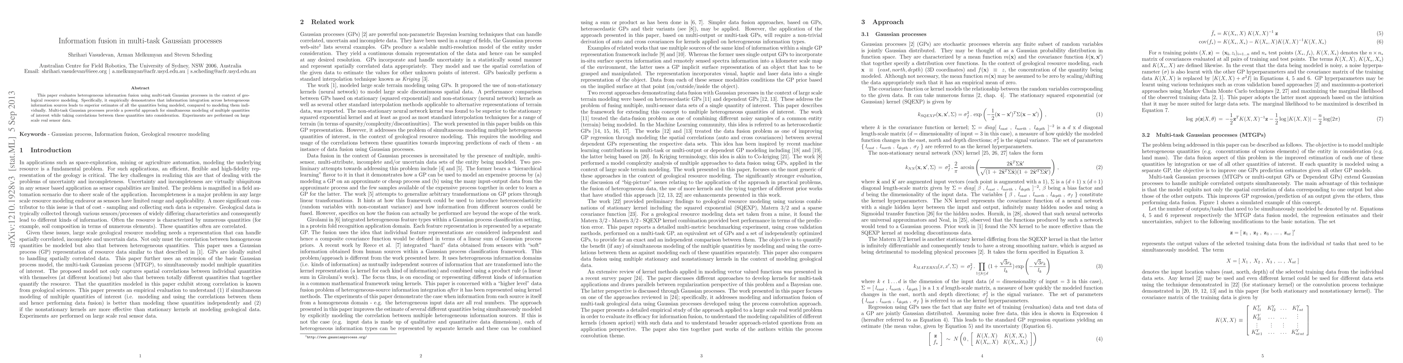 This paper evaluates heterogeneous information fusion using multi-task Gaussian processes in the context of geological resource modeling. Specifically, it empirically demonstrates that information integration across heterogeneous information sources leads to superior estimates of all the quantities being modeled, compared to modeling them individually. Multi-task Gaussian processes provide a powerful approach for simultaneous modeling of multiple quantities of interest while taking correlations between these quantities into consideration. Experiments are performed on large scale real sensor data.