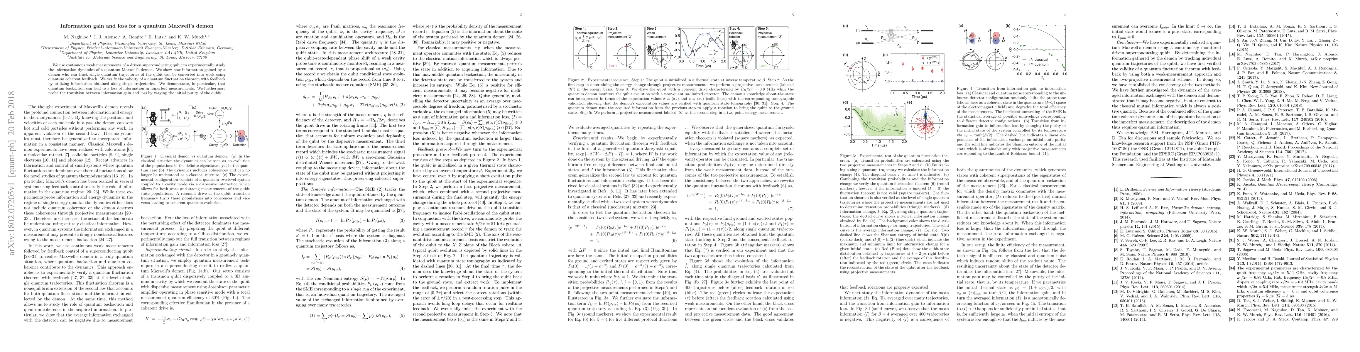 This paper experimentally investigates the information dynamics of a quantum Maxwell's demon using continuous weak measurements on a superconducting qubit. It demonstrates how information gained can be converted into work via quantum coherent feedback and verifies a quantum fluctuation theorem with feedback, showing that quantum backaction can lead to information loss in imperfect measurements.