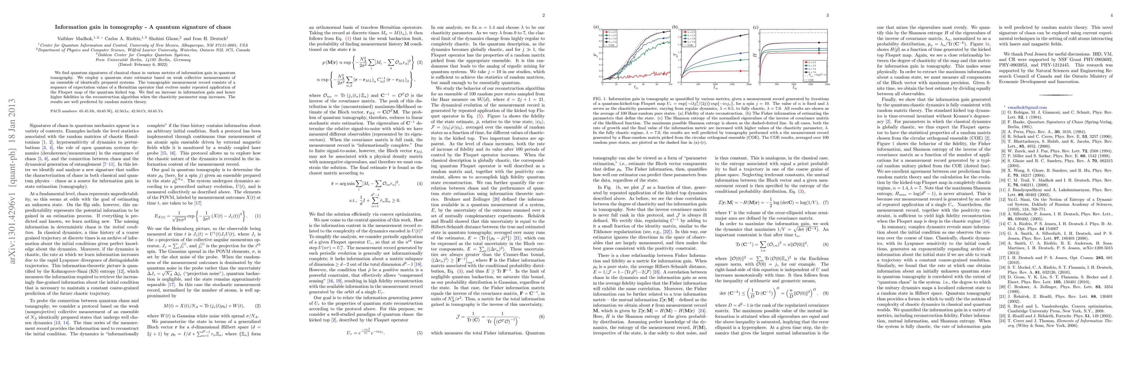 The study reveals quantum signatures of classical chaos through metrics of information gain in quantum tomography, using weak collective measurements. Higher chaoticity parameters correlate with increased information gain and improved reconstruction fidelities, predictions aligning with random matrix theory.