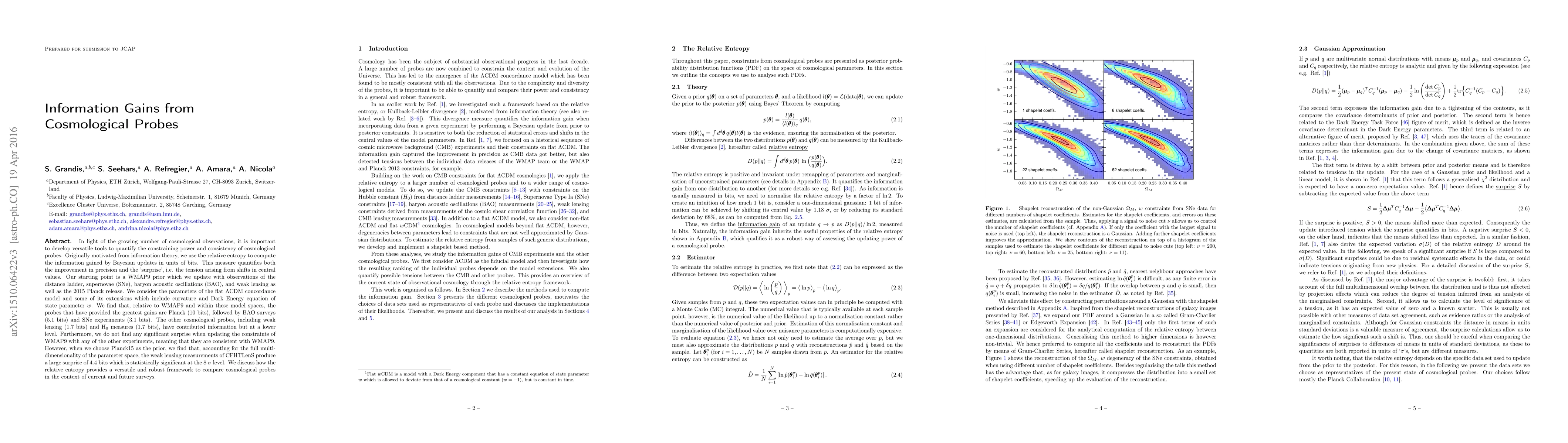 This paper quantifies the information gains from various cosmological probes using relative entropy, finding that Planck data provides the most significant improvement (10 bits) over WMAP9 priors, followed by BAO and SNe. It also highlights a notable surprise from CFHTLenS weak lensing data when updating Planck15 priors.