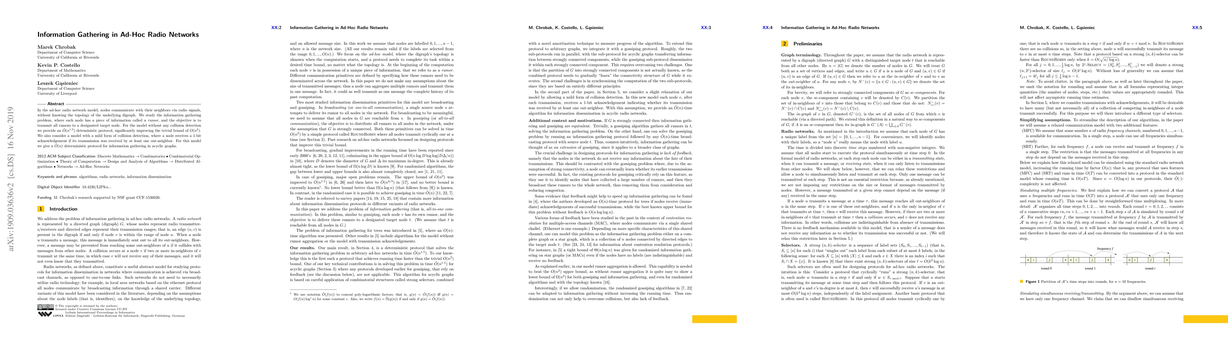 The paper introduces a novel deterministic protocol for information gathering in ad-hoc radio networks, leveraging strong selectors and Round Robin techniques to achieve an improved time complexity.