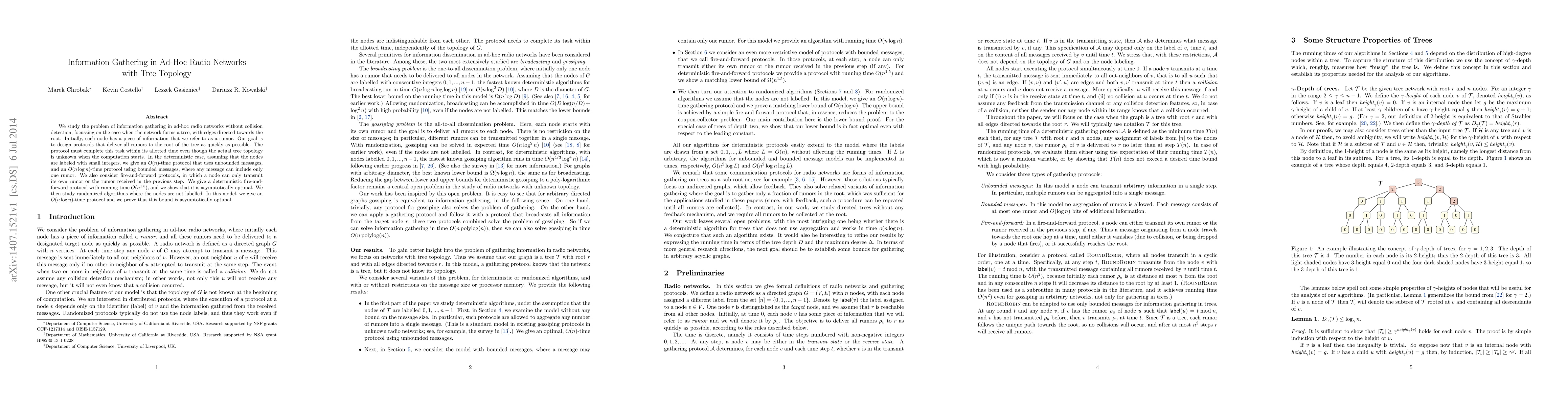This paper investigates information gathering in tree-structured ad-hoc radio networks, focusing on delivering all node rumors to the root efficiently. It presents deterministic protocols with varying message sizes and introduces a fire-and-forward method, proving its optimality, while also considering randomized algorithms without node labels.