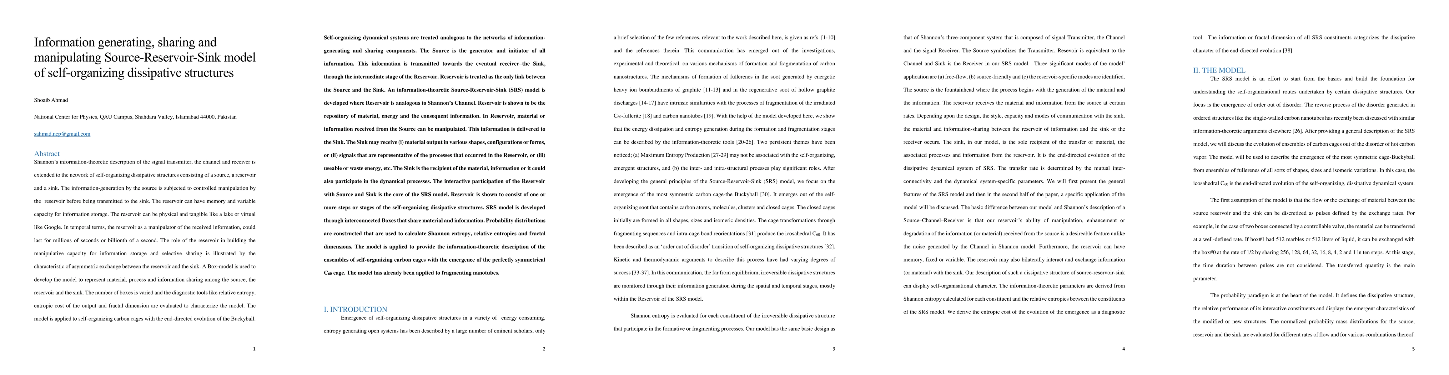 This paper proposes an information-theoretic model for self-organizing dissipative structures, consisting of a source, reservoir, and sink, where the reservoir manipulates and selectively shares information generated by the source. The model is applied to carbon cages, demonstrating the evolution of the buckyball.