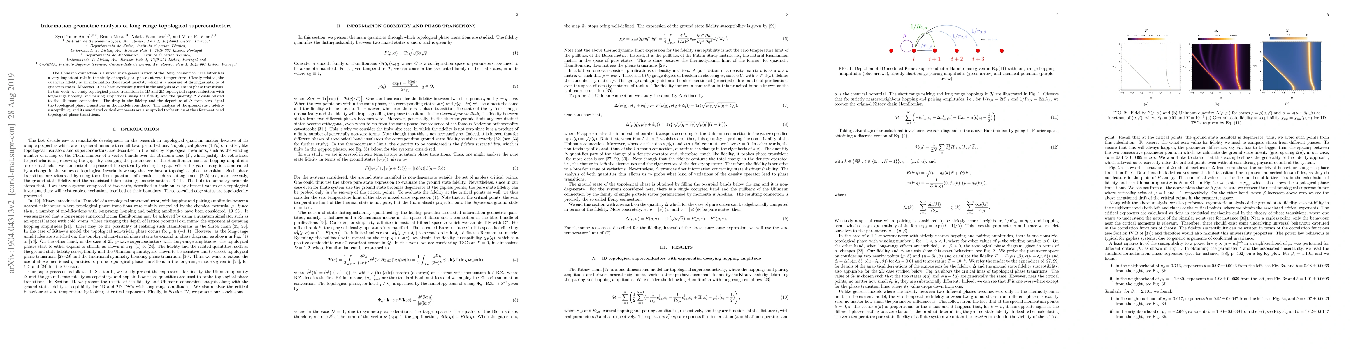 The Uhlmann connection is a mixed state generalisation of the Berry connection. The latter has a very important role in the study of topological phases at zero temperature. Closely related, the quantum fidelity is an information theoretical quantity which is a measure of distinguishability of quantum states. Moreover, it has been extensively used in the analysis of quantum phase transitions. In this work, we study topological phase transitions in 1D and 2D topological superconductors with long-range hopping and pairing amplitudes, using the fidelity and the quantity $\Delta$ closely related to the Uhlmann connection. The drop in the fidelity and the departure of $\Delta$ from zero signal the topological phase transitions in the models considered. The analysis of the ground state fidelity susceptibility and its associated critical exponents are also applied to the study of the aforementioned topological phase transitions.