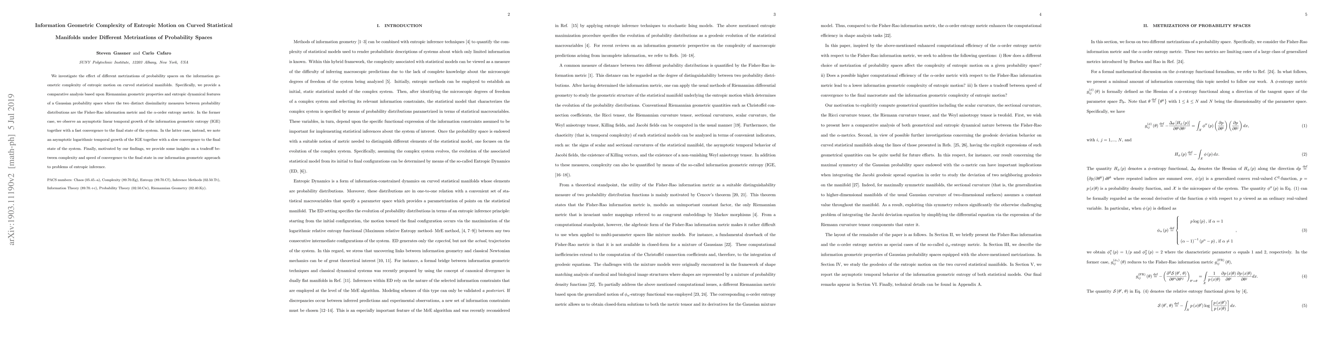 We investigate the effect of different metrizations of probability spaces on the information geometric complexity of entropic motion on curved statistical manifolds. Specifically, we provide a comparative analysis based upon Riemannian geometric properties and entropic dynamical features of a Gaussian probability space where the two distinct dissimilarity measures between probability distributions are the Fisher-Rao information metric and the alpha-order entropy metric. In the former case, we observe an asymptotic linear temporal growth of the information geometric entropy (IGE) together with a fast convergence to the final state of the system. In the latter case, instead, we note an asymptotic logarithmic temporal growth of the IGE together with a slow convergence to the final state of the system. Finally, motivated by our findings, we provide some insights on a tradeoff between complexity and speed of convergence to the final state in our information geometric approach to problems of entropic inference.