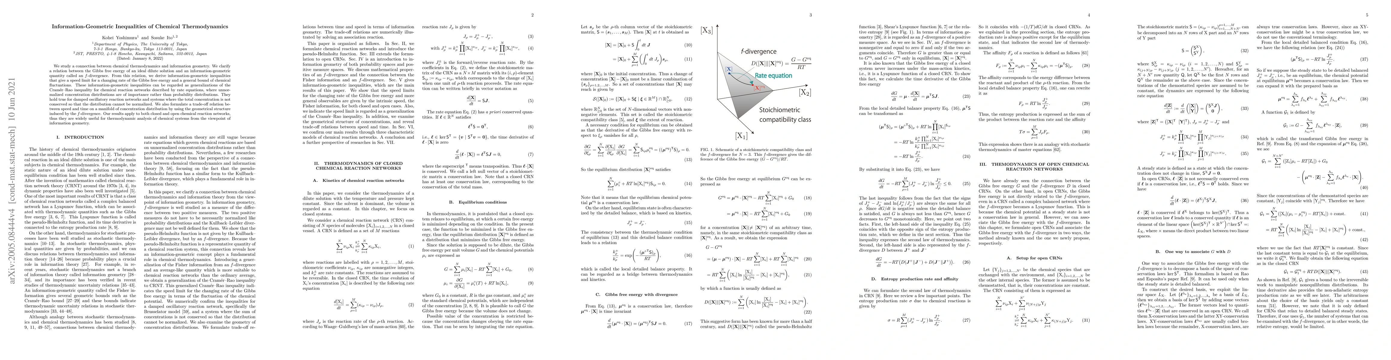 This paper connects chemical thermodynamics with information geometry, deriving information-geometric inequalities that generalize the Cramér-Rao inequality for chemical reaction networks. These inequalities provide bounds on the rate of Gibbs free energy change and chemical fluctuations, applicable to both closed and open systems.