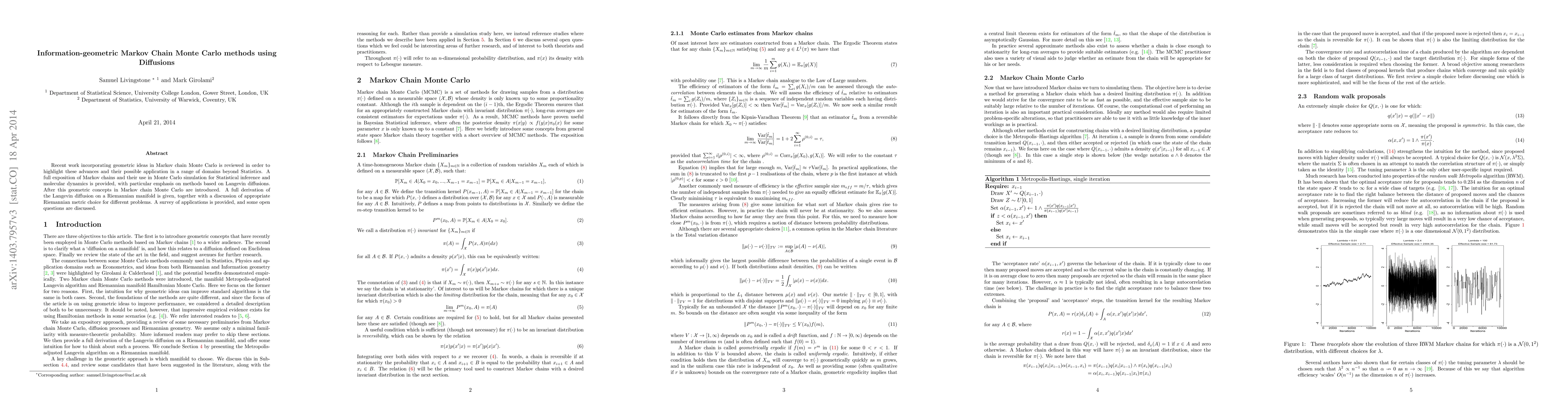 Recent work incorporating geometric ideas in Markov chain Monte Carlo is reviewed in order to highlight these advances and their possible application in a range of domains beyond Statistics. A full exposition of Markov chains and their use in Monte Carlo simulation for Statistical inference and molecular dynamics is provided, with particular emphasis on methods based on Langevin diffusions. After this geometric concepts in Markov chain Monte Carlo are introduced. A full derivation of the Langevin diffusion on a Riemannian manifold is given, together with a discussion of appropriate Riemannian metric choice for different problems. A survey of applications is provided, and some open questions are discussed.