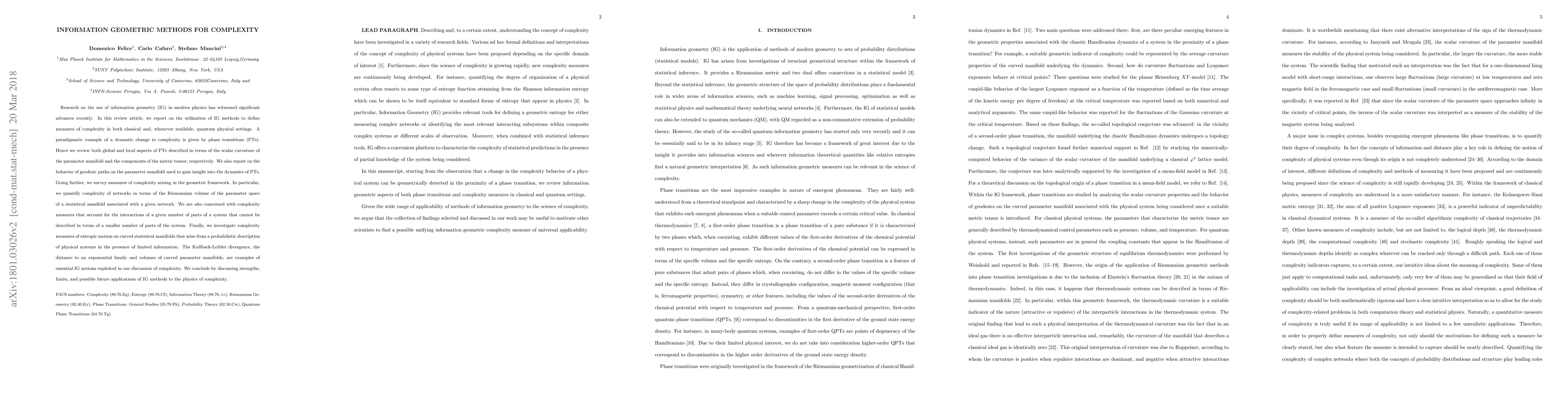 This review article explores the application of information geometry methods to measure complexity in classical and quantum systems, including phase transitions, networks, and entropic motion, offering new insights into the physics of complexity.