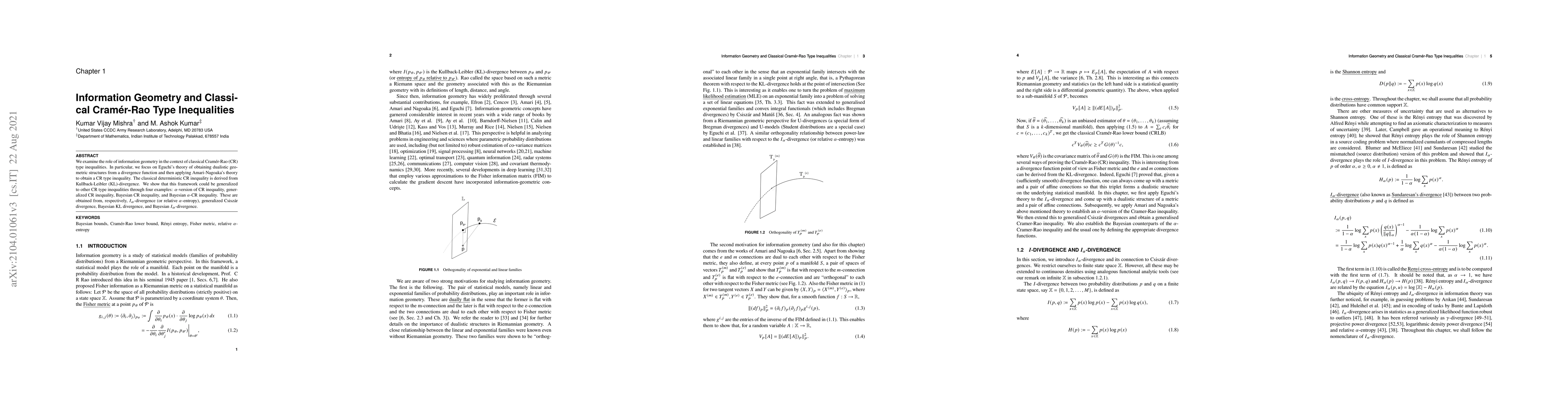 This paper explores the application of information geometry to derive classical Cramér-Rao (CR) type inequalities using Eguchi's theory and Amari-Nagaoaka's framework. It generalizes the classical CR inequality to four specific types through various divergence functions.