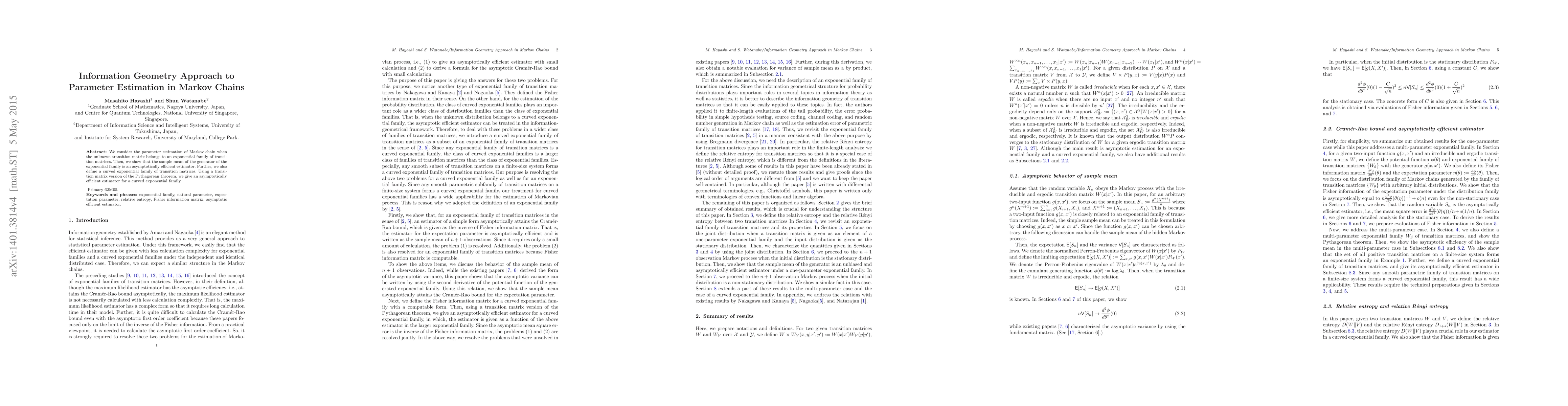 This paper proposes an information geometry approach for parameter estimation in Markov chains, demonstrating that the sample mean of the generator of an exponential family of transition matrices is an asymptotically efficient estimator. It also introduces a curved exponential family for transition matrices and provides an asymptotically efficient estimator using a transition matrix version of the Pythagorean theorem.