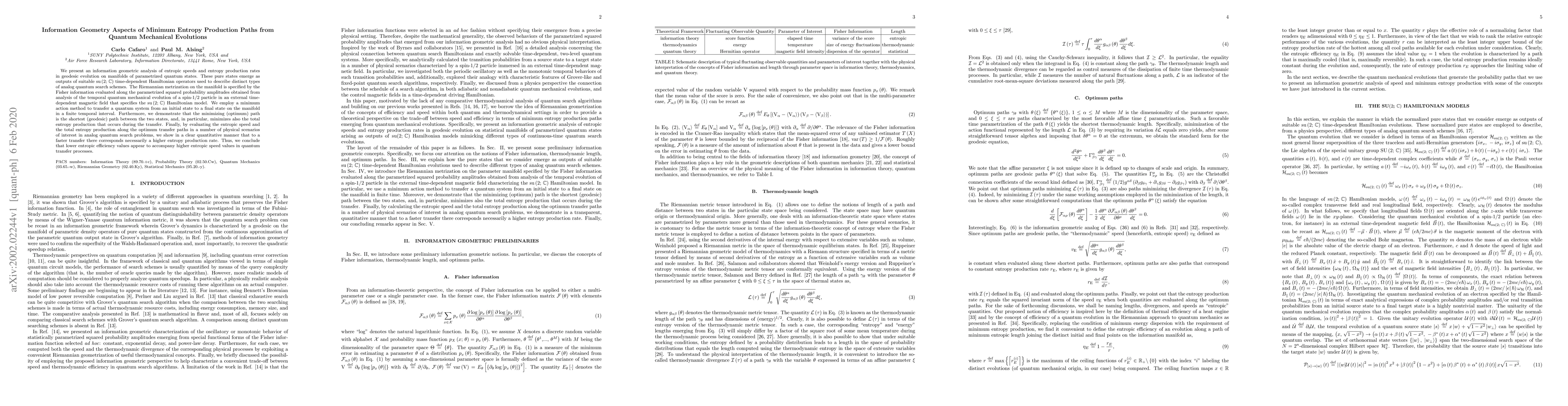 This paper uses information geometry to analyze the paths of minimum entropy production in quantum mechanical evolutions, showing that the optimal transfer path is both the shortest geodesic and minimizes total entropy production. It concludes that faster quantum transfers inherently result in higher entropy production rates.