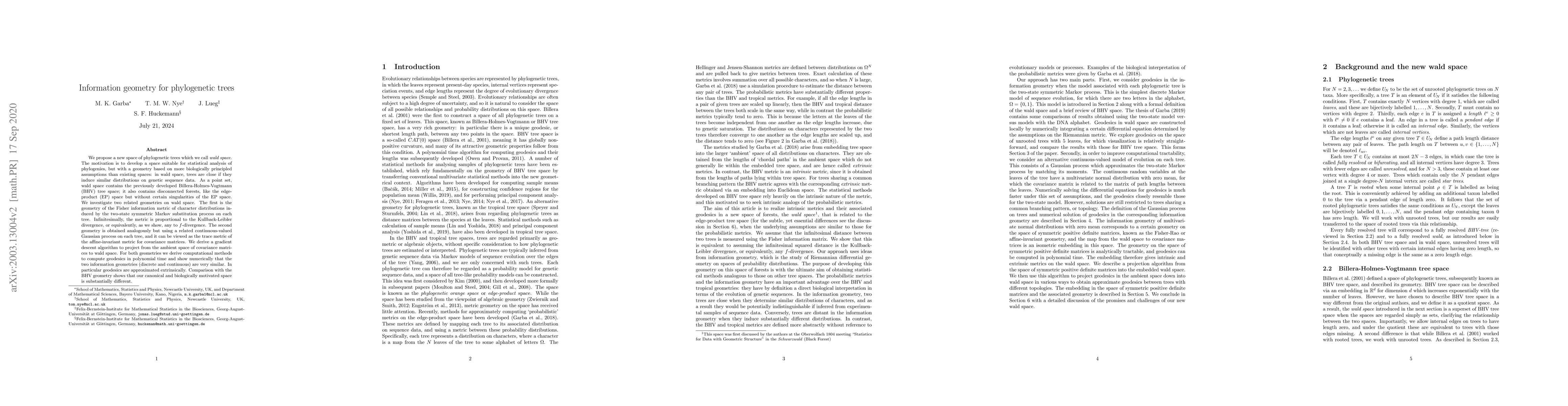 This paper introduces "wald space," a novel space for phylogenetic trees based on biologically grounded assumptions, where trees are considered close if they induce similar genetic sequence distributions. It explores two geometries on wald space: the Fisher information metric for Markov substitution and a trace metric for Gaussian processes, and provides computational methods for geodesics in both. The proposed space differs significantly from existing phylogenetic spaces.
