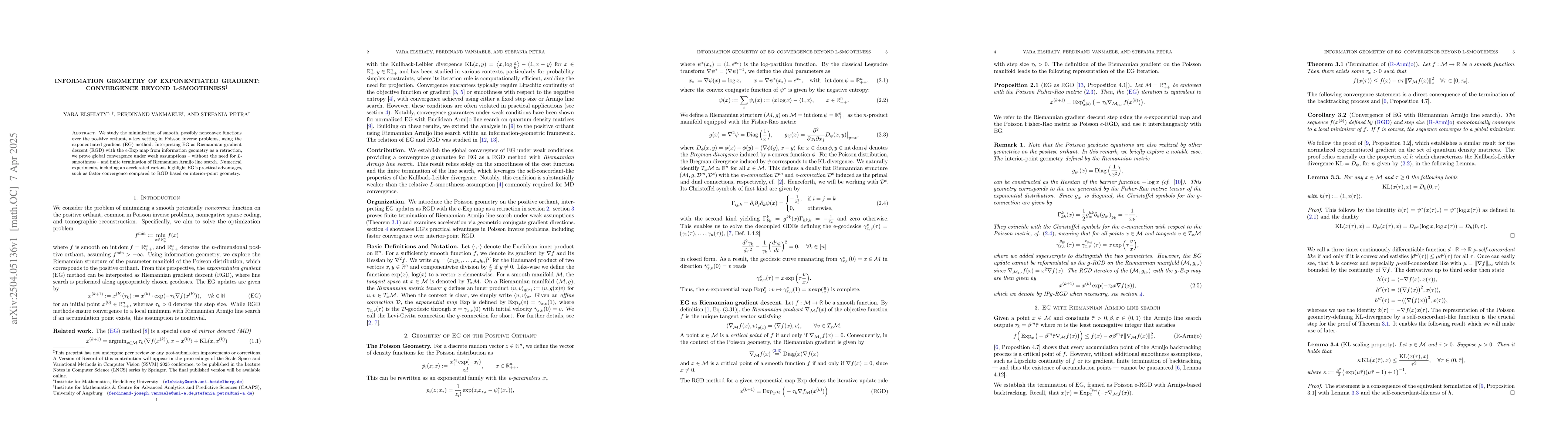 The research employs the exponentiated gradient (EG) method, interpreting it as Riemannian gradient descent (RGD) with the $e$-Exp map from information geometry as a retraction to study function minimization over the positive orthant, crucial in Poisson inverse problems.