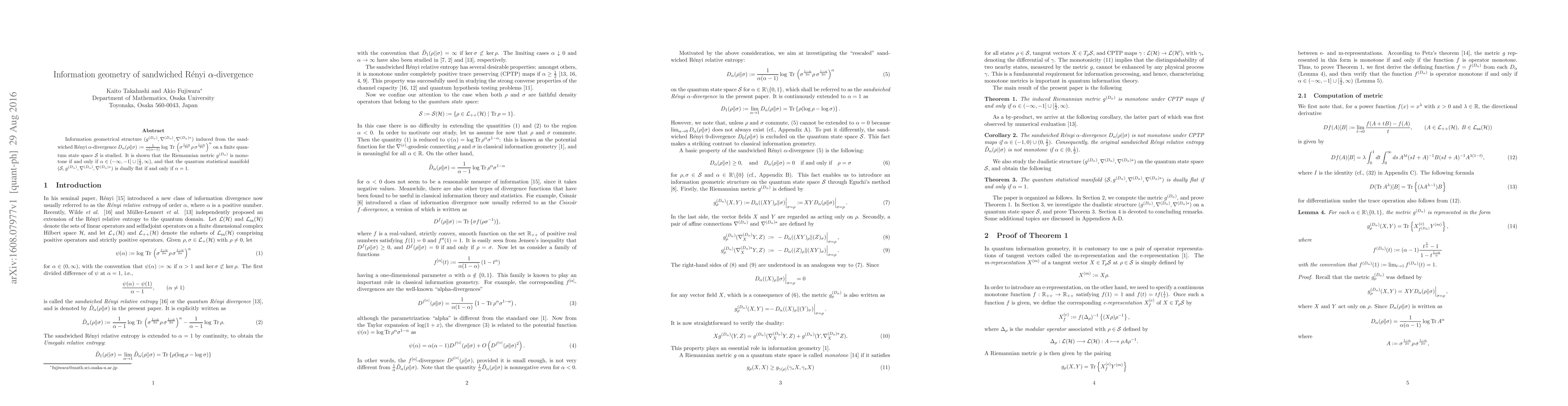 This paper explores the information geometry of the sandwiched R\'enyi $\alpha$-divergence on a finite quantum state space, revealing that the Riemannian metric is monotone under specific $\alpha$ values and that the quantum statistical manifold is dually flat only when $\alpha=1.
