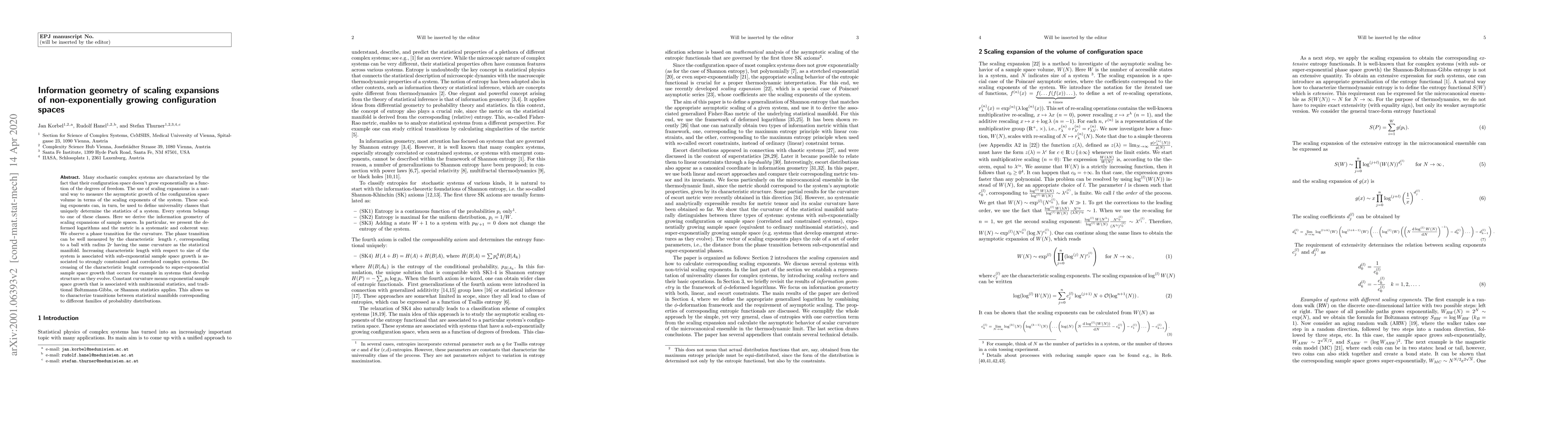 Many stochastic complex systems are characterized by the fact that their configuration space doesn't grow exponentially as a function of the degrees of freedom. The use of scaling expansions is a natural way to measure the asymptotic growth of the configuration space volume in terms of the scaling exponents of the system. These scaling exponents can, in turn, be used to define universality classes that uniquely determine the statistics of a system. Every system belongs to one of these classes. Here we derive the information geometry of scaling expansions of sample spaces. In particular, we present the deformed logarithms and the metric in a systematic and coherent way. We observe a phase transition for the curvature. The phase transition can be well measured by the characteristic length r, corresponding to a ball with radius 2r having the same curvature as the statistical manifold. Increasing characteristic length with respect to the size of the system is associated with sub-exponential sample space growth is associated with strongly constrained and correlated complex systems. Decreasing of the characteristic length corresponds to super-exponential sample space growth that occurs for example in systems that develop structure as they evolve. Constant curvature means exponential sample space growth that is associated with multinomial statistics, and traditional Boltzmann-Gibbs, or Shannon statistics applies. This allows us to characterize transitions between statistical manifolds corresponding to different families of probability distributions.