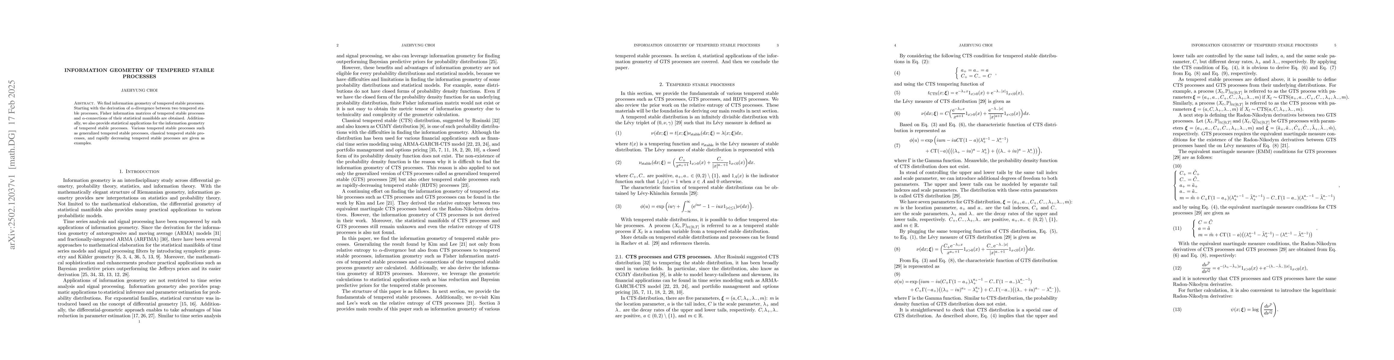The research derives the information geometry of tempered stable processes, starting with the α-divergence between two such processes, to obtain Fisher information matrices and α-connections of their statistical manifolds. Examples include generalized tempered stable processes, classical tempered stable processes, and rapidly decreasing tempered stable processes.