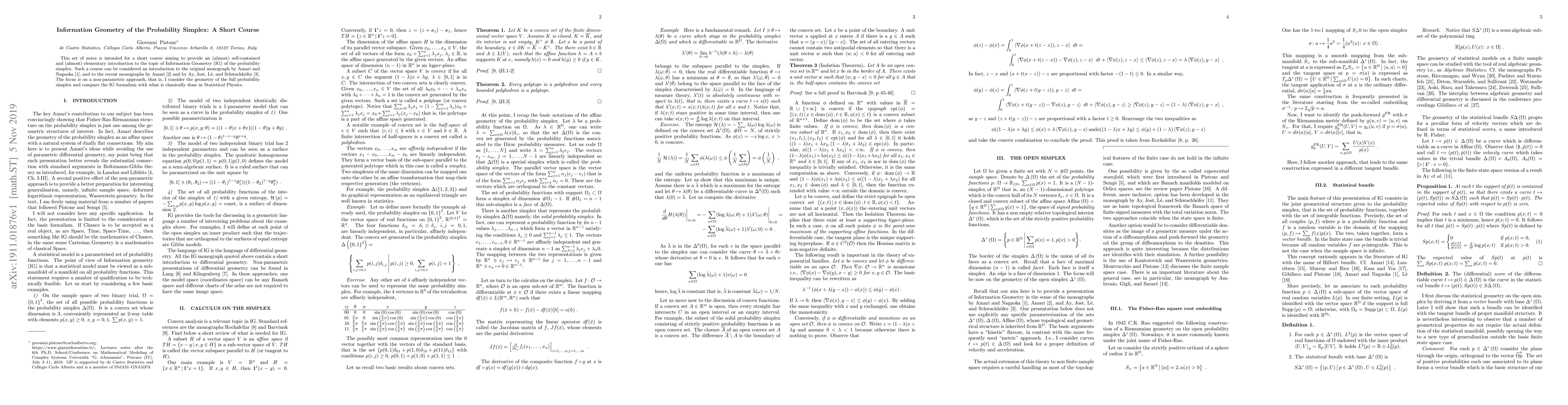 This set of notes is intended for a short course aiming to provide an (almost) self-contained and (almost) elementary introduction to the topic of Information Geometry (IG) of the probability simplex. Such a course can be considered an introduction to the original monograph by Amari and Nagaoka (2000), and to the recent monographs by Amari (2016} and by Ay et al. (2017). The focus is on a non-parametric approach, that is, I consider the geometry of the full probability simplex and compare the IG formalism with what is classically done in Statistical Physics.