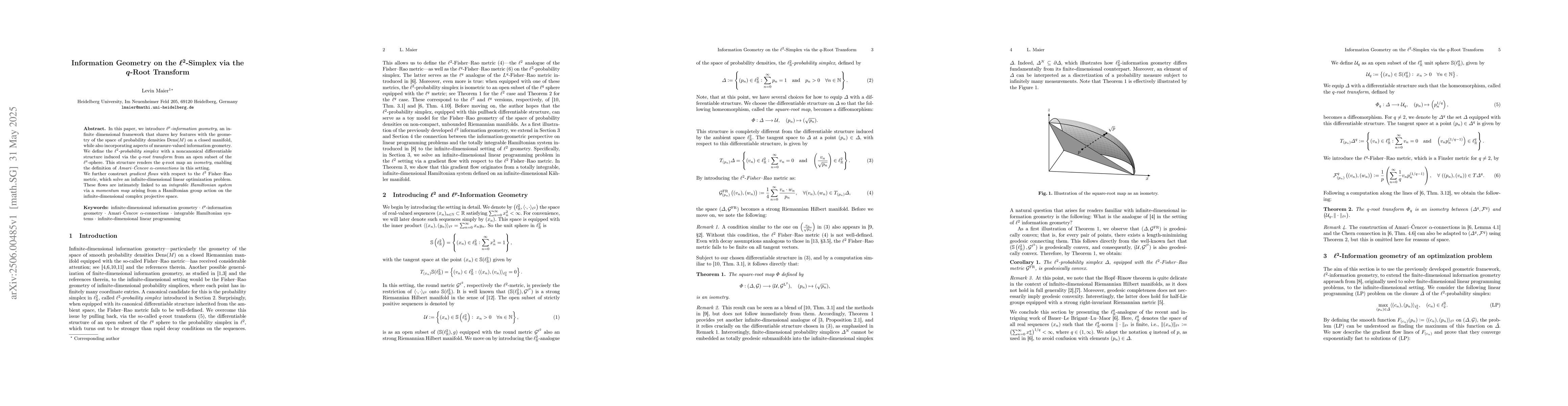 The paper introduces $\ell^p$-information geometry, an infinite-dimensional framework, and defines the $\ell^2$-probability simplex with a differentiable structure via the $q$-root transform from an open subset of the $\ell^p$-sphere, enabling the definition of Amari--\v{C}encov $\alpha$-connections and gradient flows with respect to the $\ell^2$ Fisher--Rao metric.