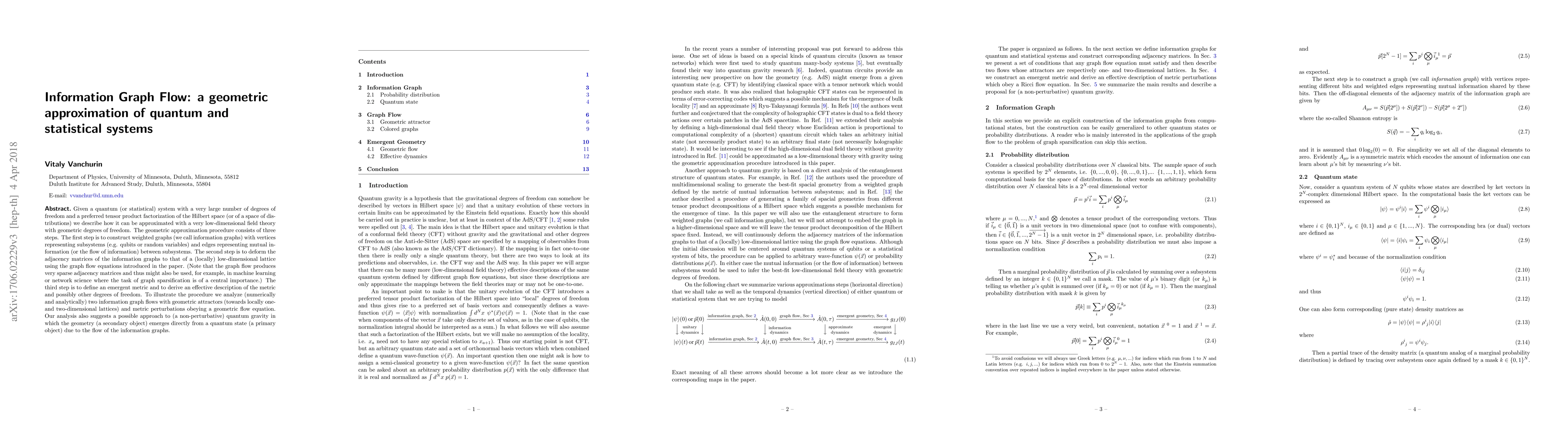 Given a quantum (or statistical) system with a very large number of degrees of freedom and a preferred tensor product factorization of the Hilbert space (or of a space of distributions) we describe how it can be approximated with a very low-dimensional field theory with geometric degrees of freedom. The geometric approximation procedure consists of three steps. The first step is to construct weighted graphs (we call information graphs) with vertices representing subsystems (e.g. qubits or random variables) and edges representing mutual information (or the flow of information) between subsystems. The second step is to deform the adjacency matrices of the information graphs to that of a (locally) low-dimensional lattice using the graph flow equations introduced in the paper. (Note that the graph flow produces very sparse adjacency matrices and thus might also be used, for example, in machine learning or network science where the task of graph sparsification is of a central importance.) The third step is to define an emergent metric and to derive an effective description of the metric and possibly other degrees of freedom. To illustrate the procedure we analyze (numerically and analytically) two information graph flows with geometric attractors (towards locally one- and two-dimensional lattices) and metric perturbations obeying a geometric flow equation. Our analysis also suggests a possible approach to (a non-perturbative) quantum gravity in which the geometry (a secondary object) emerges directly from a quantum state (a primary object) due to the flow of the information graphs.
