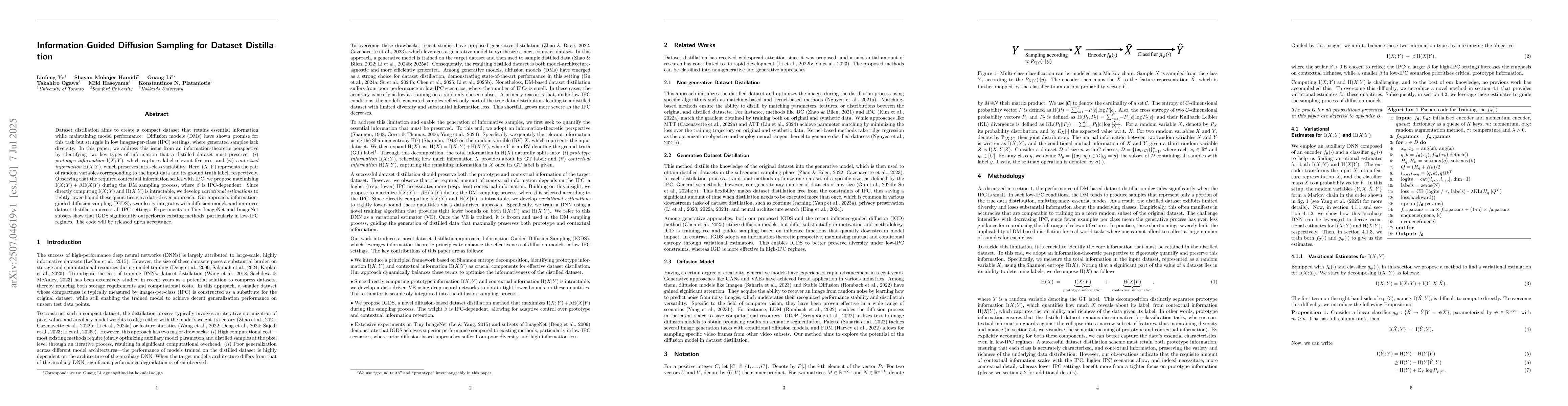 Dataset distillation aims to create a compact dataset that retains essential information while maintaining model performance. Diffusion models (DMs) have shown promise for this task but struggle in low images-per-class (IPC) settings, where generated samples lack diversity. In this paper, we address this issue from an information-theoretic perspective by identifying two key types of information that a distilled dataset must preserve: ($i$) prototype information $\mathrm{I}(X;Y)$, which captures label-relevant features; and ($ii$) contextual information $\mathrm{H}(X | Y)$, which preserves intra-class variability. Here, $(X,Y)$ represents the pair of random variables corresponding to the input data and its ground truth label, respectively. Observing that the required contextual information scales with IPC, we propose maximizing $\mathrm{I}(X;Y) + \beta \mathrm{H}(X | Y)$ during the DM sampling process, where $\beta$ is IPC-dependent. Since directly computing $\mathrm{I}(X;Y)$ and $\mathrm{H}(X | Y)$ is intractable, we develop variational estimations to tightly lower-bound these quantities via a data-driven approach. Our approach, information-guided diffusion sampling (IGDS), seamlessly integrates with diffusion models and improves dataset distillation across all IPC settings. Experiments on Tiny ImageNet and ImageNet subsets show that IGDS significantly outperforms existing methods, particularly in low-IPC regimes. The code will be released upon acceptance.