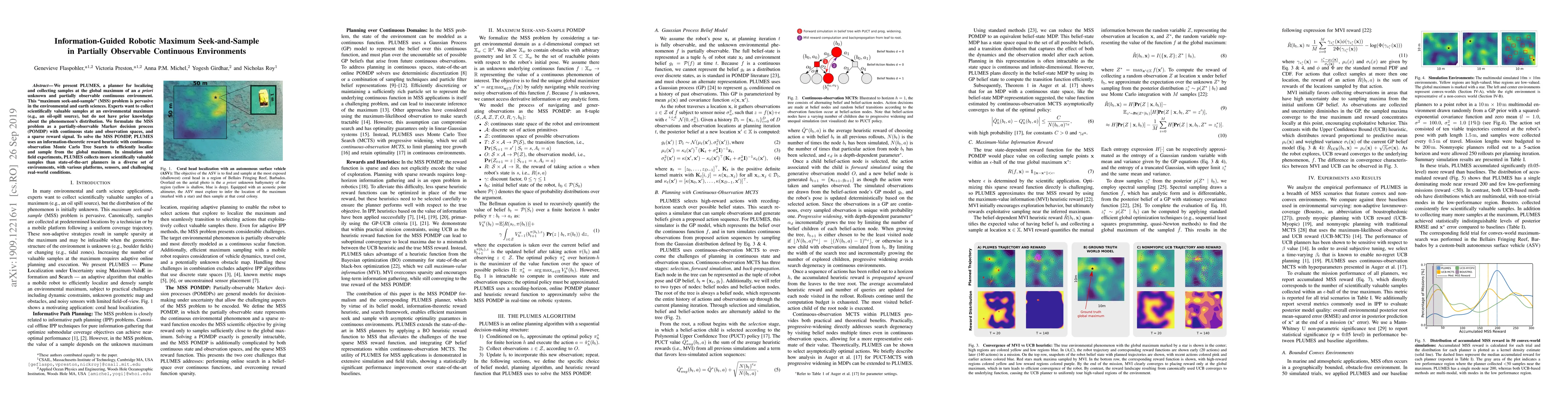 We present PLUMES, a planner to localizing and collecting samples at the global maximum of an a priori unknown and partially observable continuous environment. The "maximum-seek-and-sample" (MSS) problem is pervasive in the environmental and earth sciences. Experts want to collect scientifically valuable samples at an environmental maximum (e.g., an oil-spill source), but do not have prior knowledge about the phenomenon's distribution. We formulate the MSS problem as a partially-observable Markov decision process (POMDP) with continuous state and observation spaces, and a sparse reward signal. To solve the MSS POMDP, PLUMES uses an information-theoretic reward heuristic with continous-observation Monte Carlo Tree Search to efficiently localize and sample from the global maximum. In simulation and field experiments, PLUMES collects more scientifically valuable samples than state-of-the-art planners in a diverse set of environments, with various platforms, sensors, and challenging real-world conditions.
